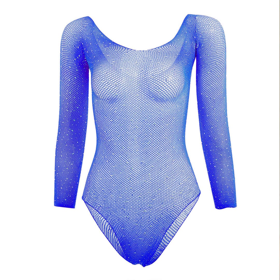 Еротичний синій прозорий Боді "Сітка" (ігровий костюм, костюм для рольових ігор) у дрібну сіточку з приклеєними стразами, довгі рукави та широкий круглий виріз горловини спереду та ззаду (можна носити з відкритими плечима), ззаду труси – сліпами.