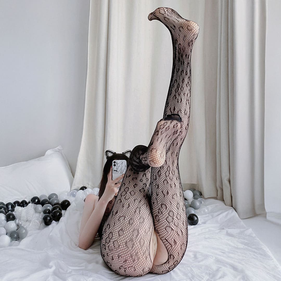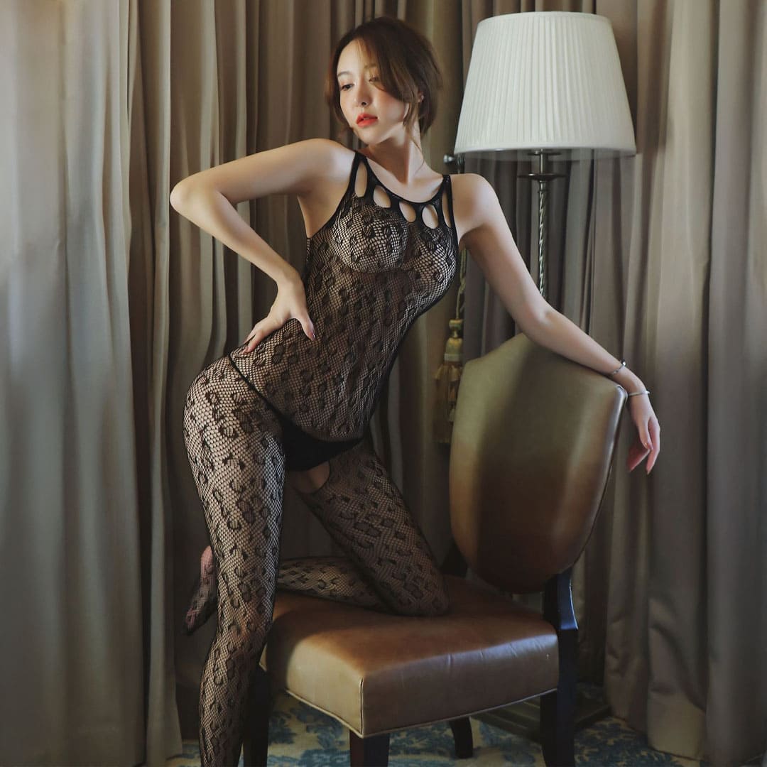 Еротичний прозорий БодіСтокінг (Боді комбінезон Сітка, ігровий костюм, костюм для рольових ігор) з малюнком у стилі "Сафарі" (леопардовий принт) на широких бретелях з вирізами кола навколо горловини, по центру ластавніци (в паху) розріз.