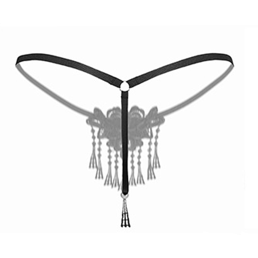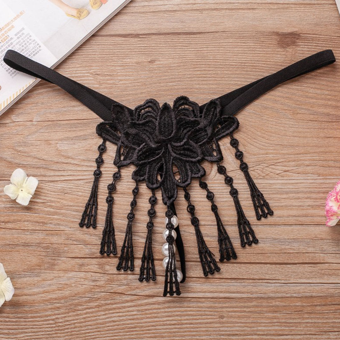 Чорні мереживні трусики з перлинною ниткою та декоративними підвісаси (бахромою).