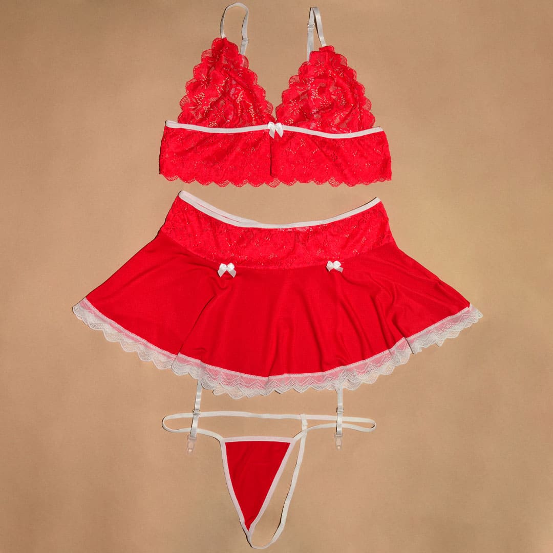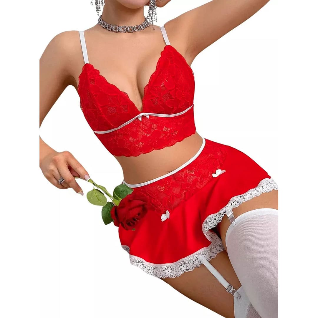 Червоний еротичний комплект (ігровий костюм, костюм для рольових ігор) топ-бюстгальтер, труси та спідниця з підтяжками для панчох (без панчох).