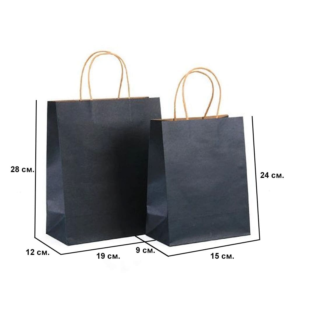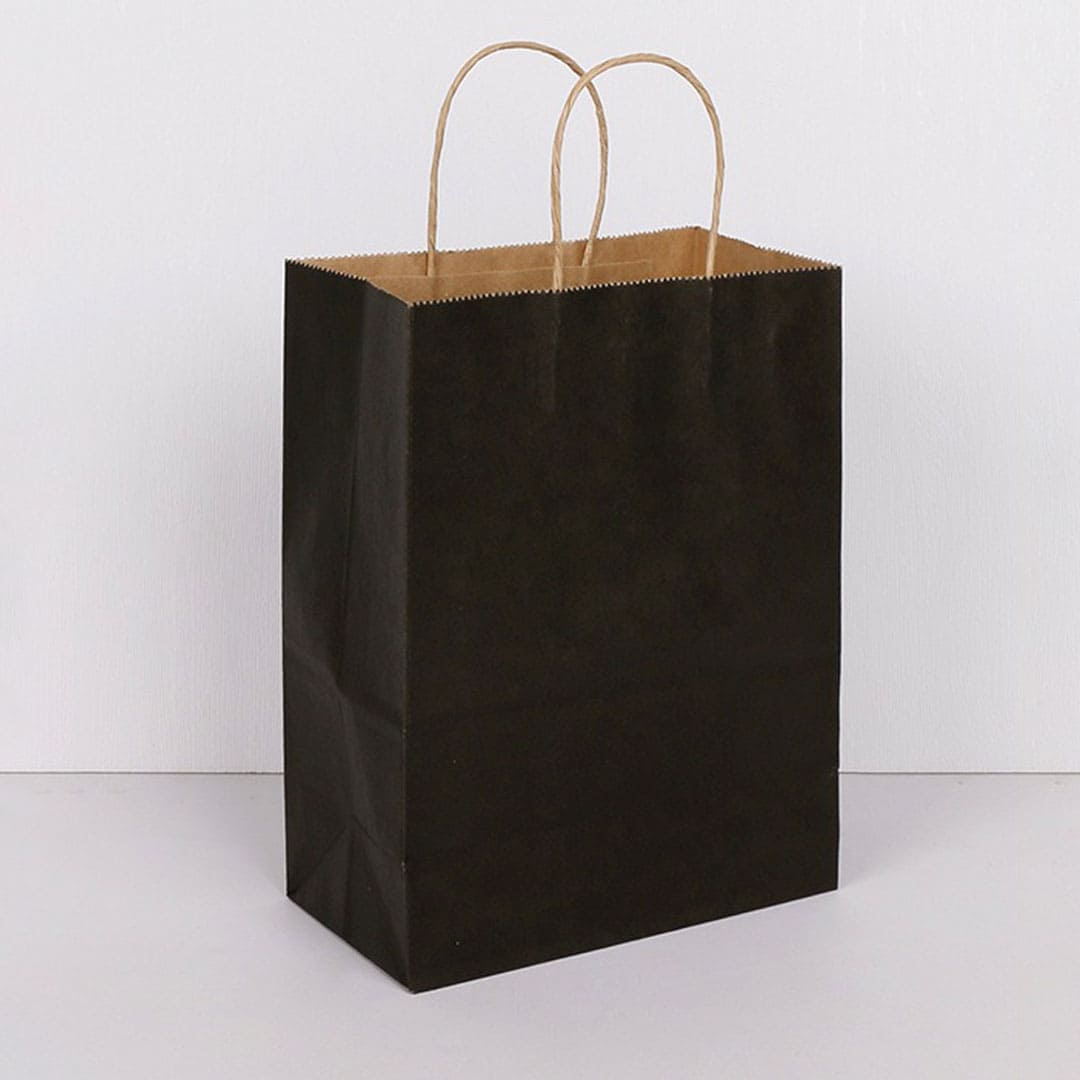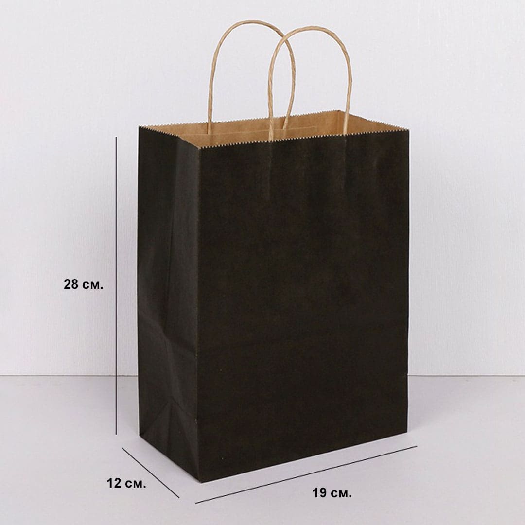Чорний крафтовий паперовий пакет з бурими крученими паперовими ручками та плоским дном.