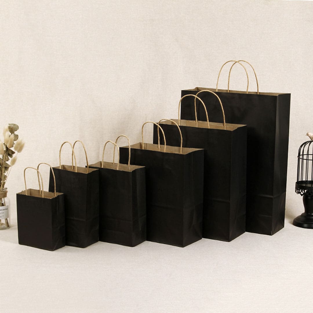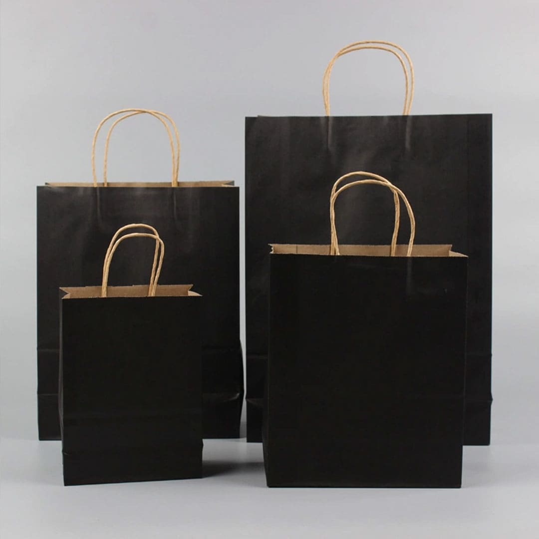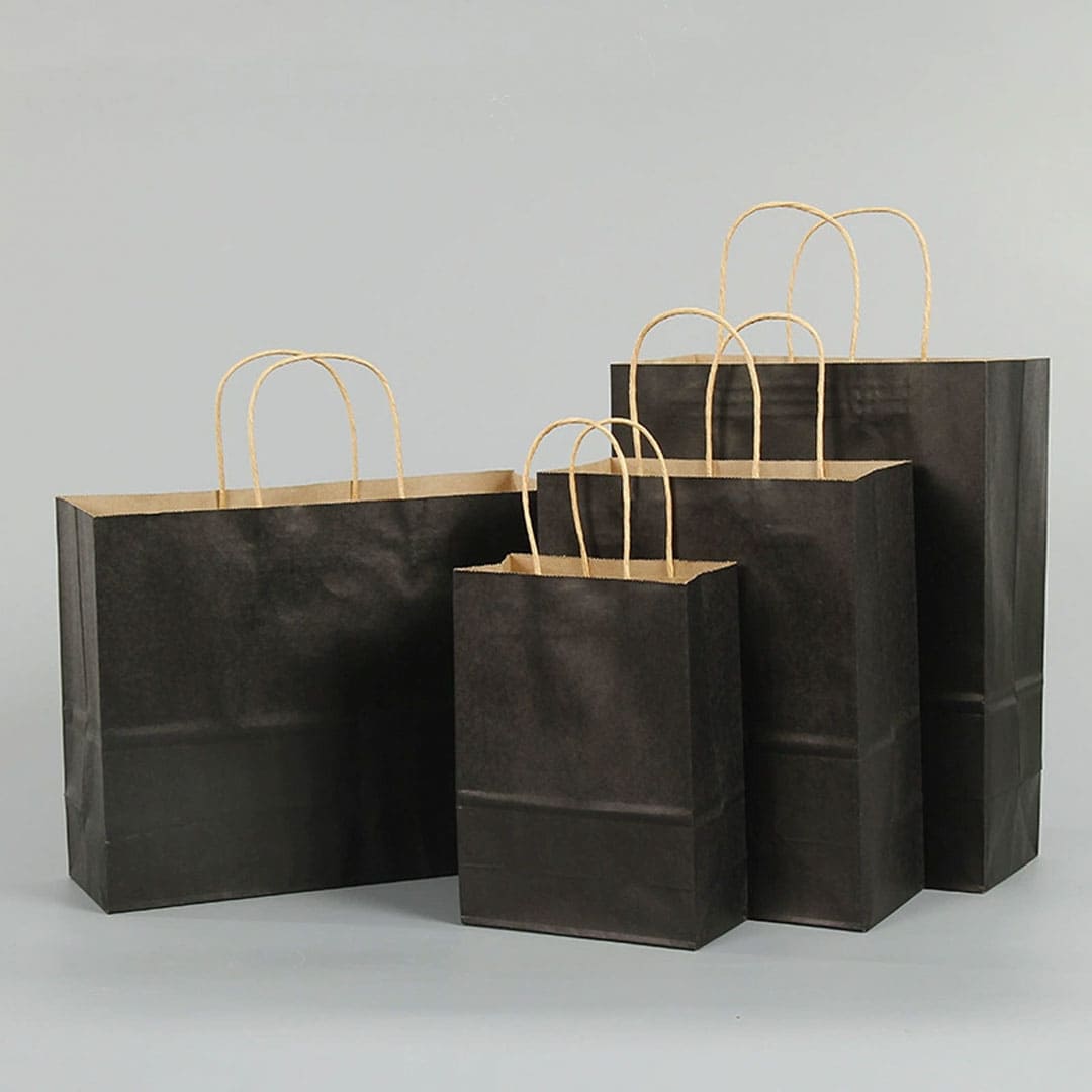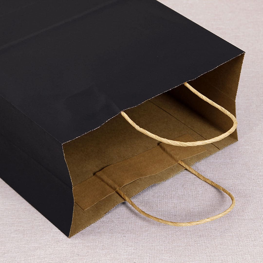 Чорний крафтовий паперовий пакет з бурими крученими паперовими ручками та плоским дном.