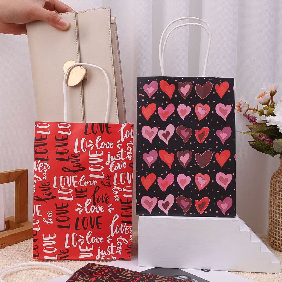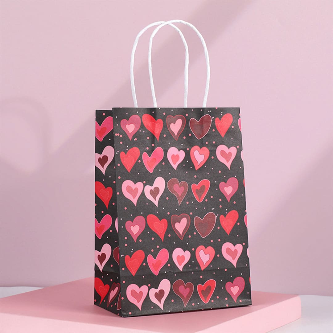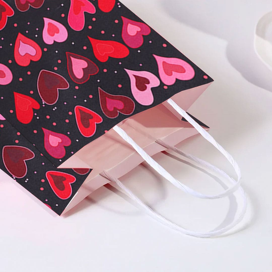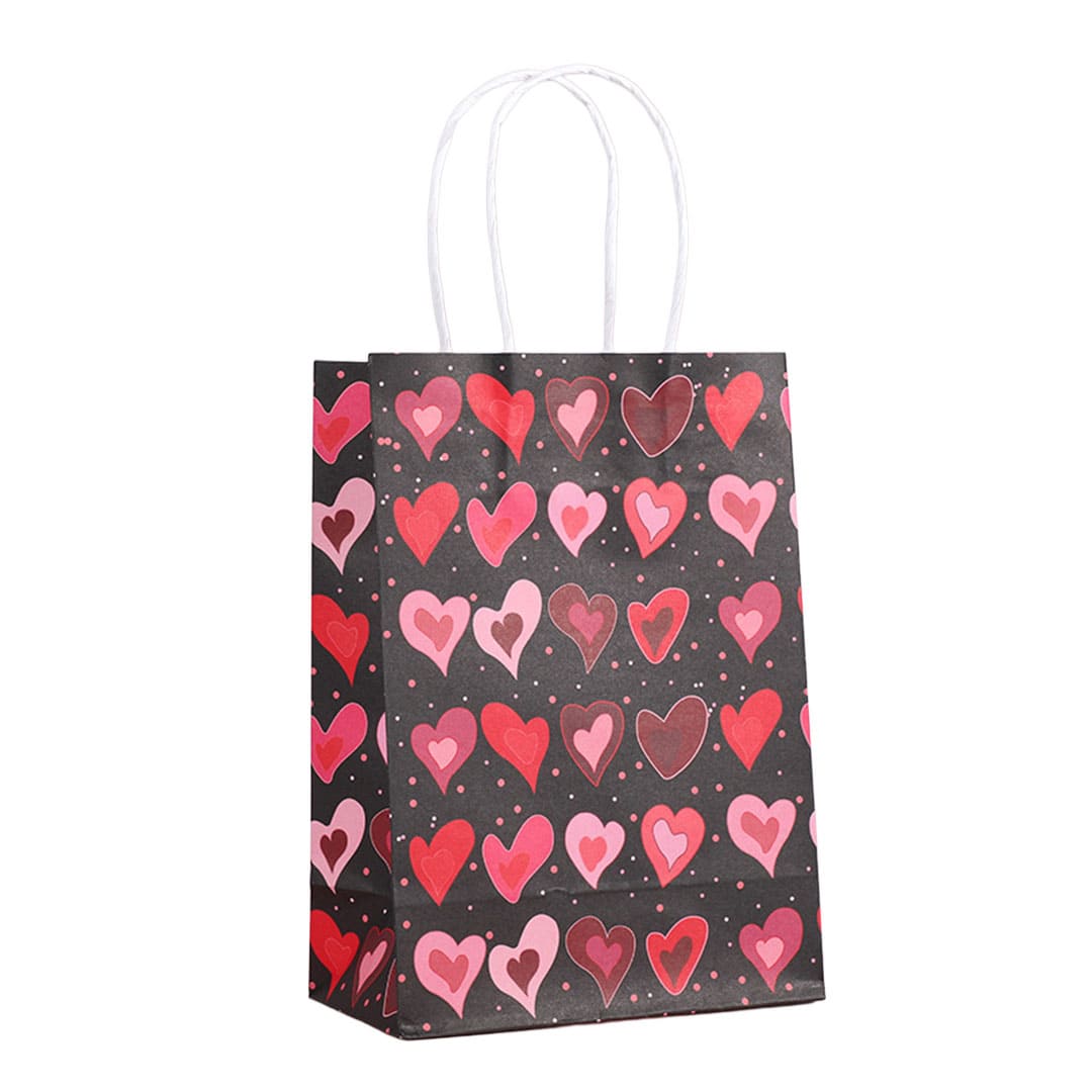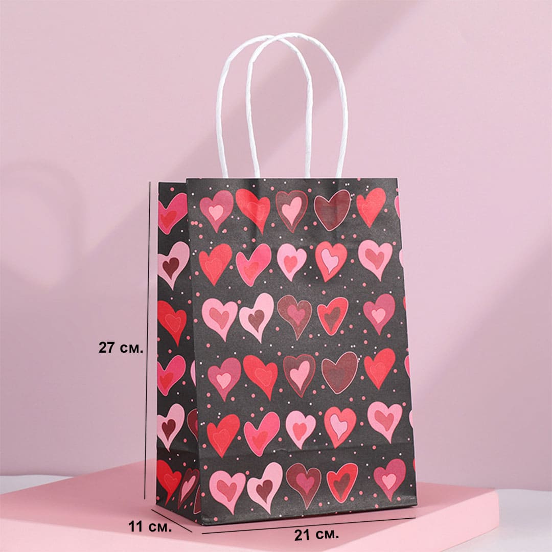Чорний паперовий подарунковий пакет з малюнком серця, білі виті паперові ручки та плоске дно.