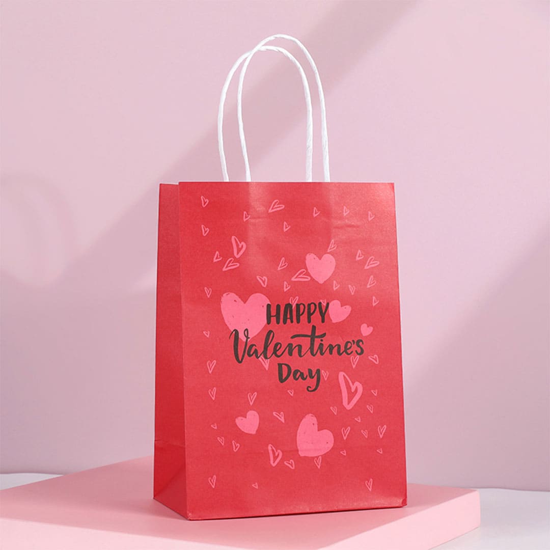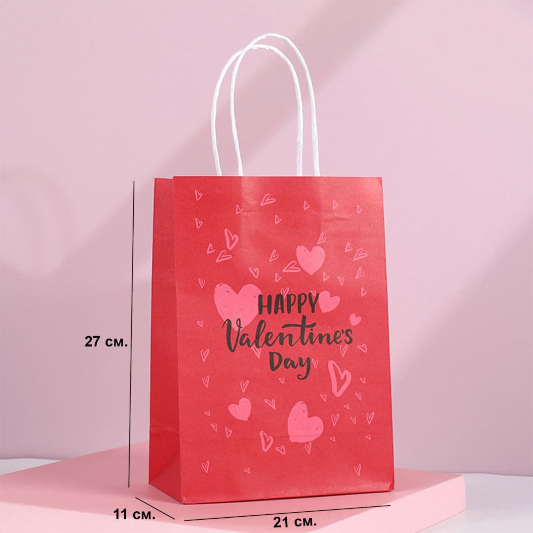 Червоний паперовий подарунковий пакет з написом "Happy Valentine's Day" та малюнком серця, білі виті паперові ручки та плоске дно.