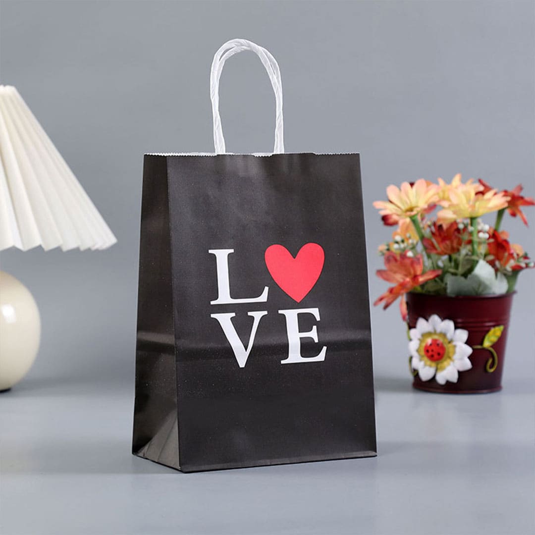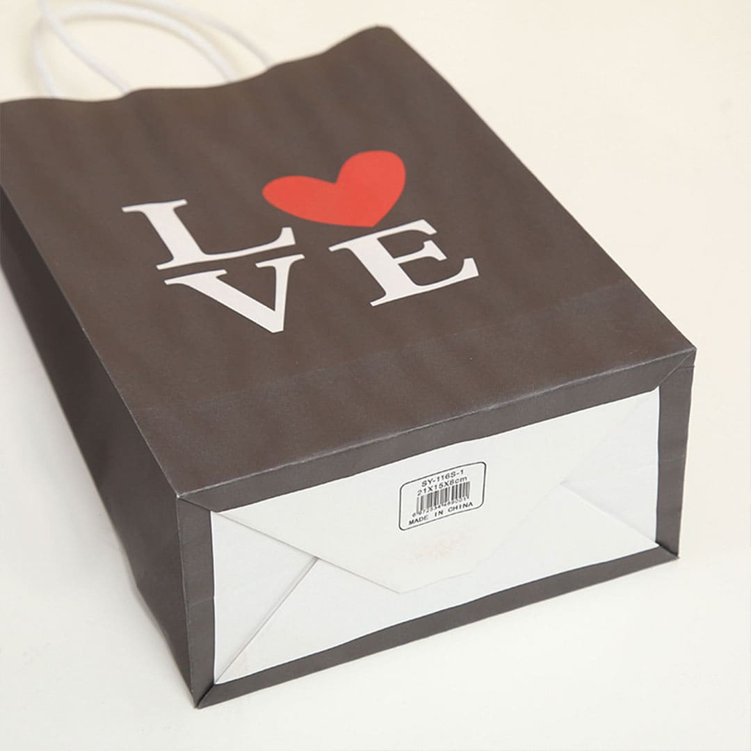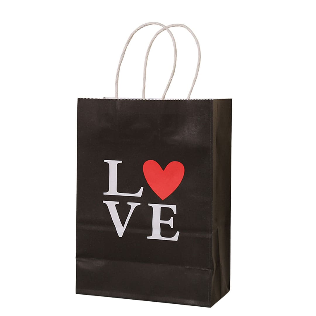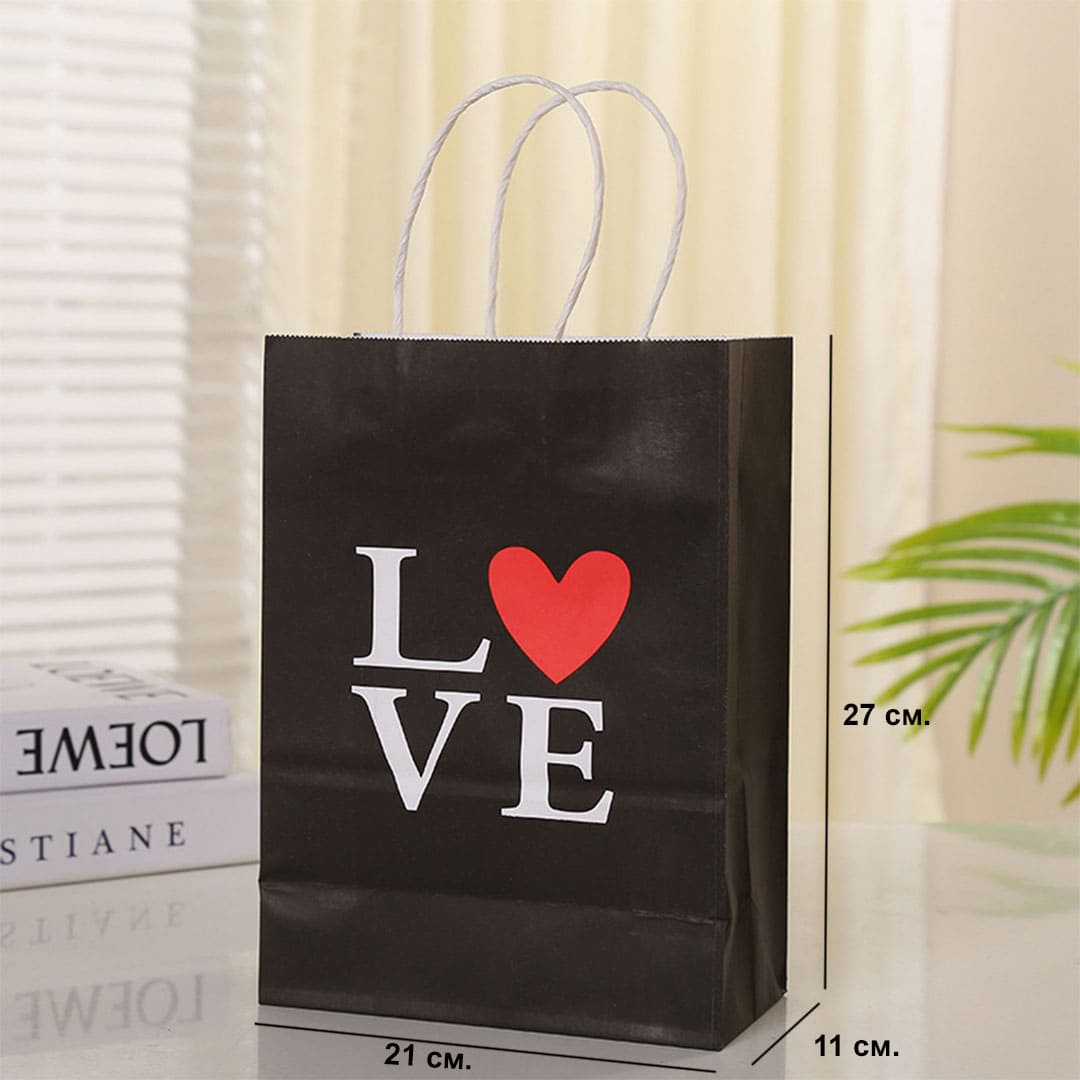 Чорний паперовий подарунковий пакет з написом "Love", білі виті паперові ручки та плоске дно.