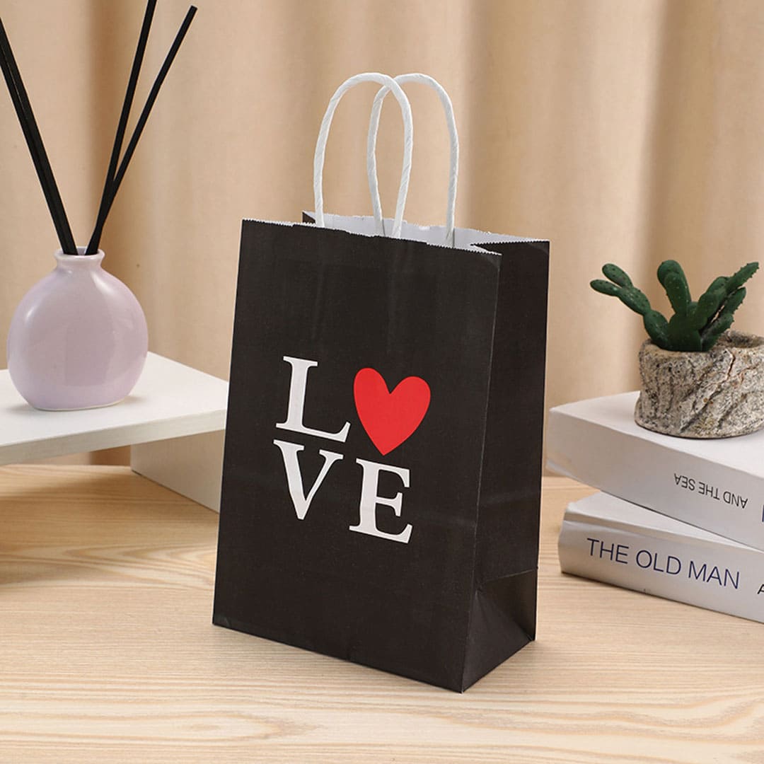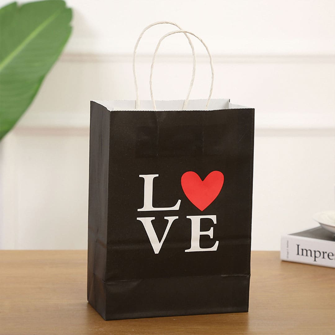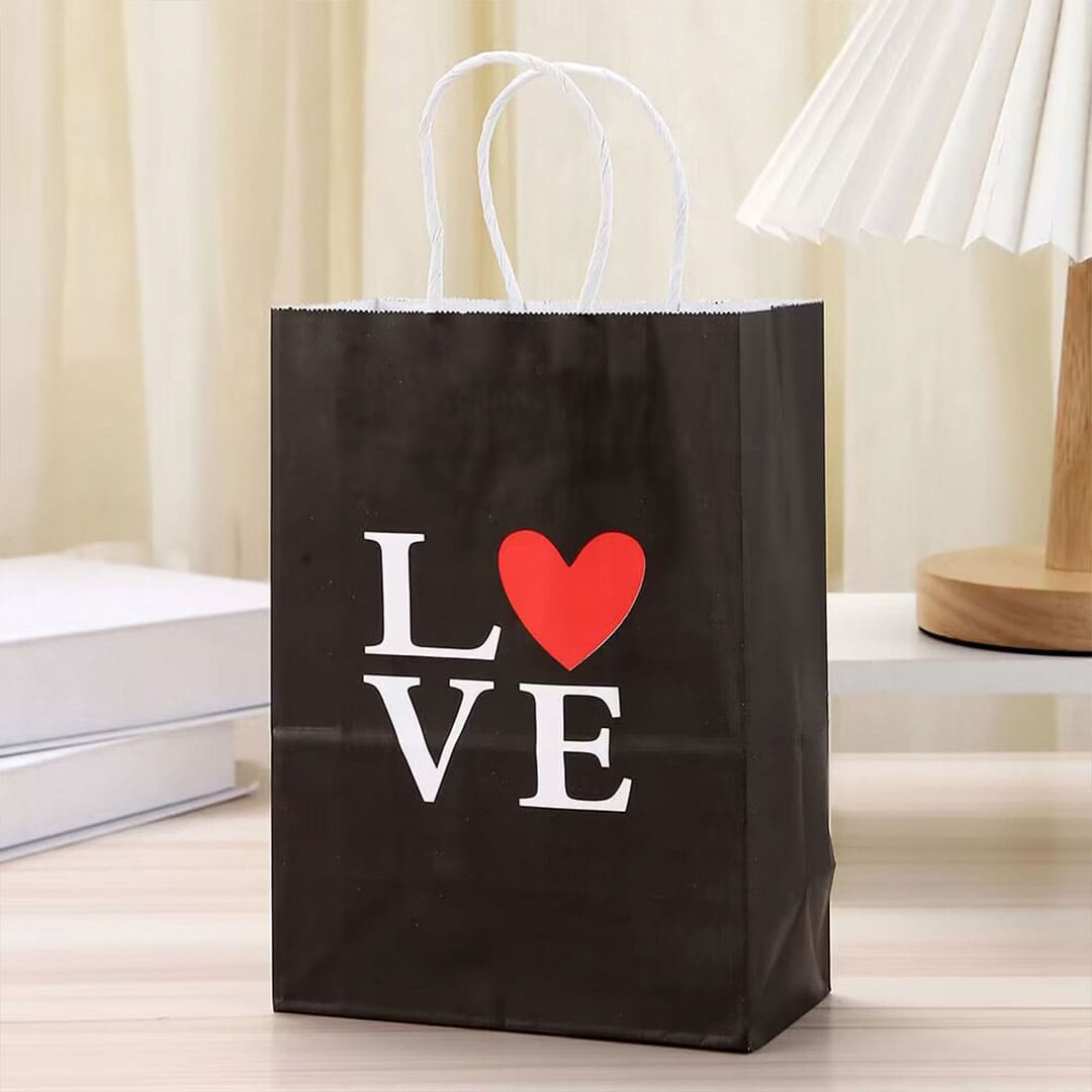 Чорний паперовий подарунковий пакет з написом "Love", білі виті паперові ручки та плоске дно.