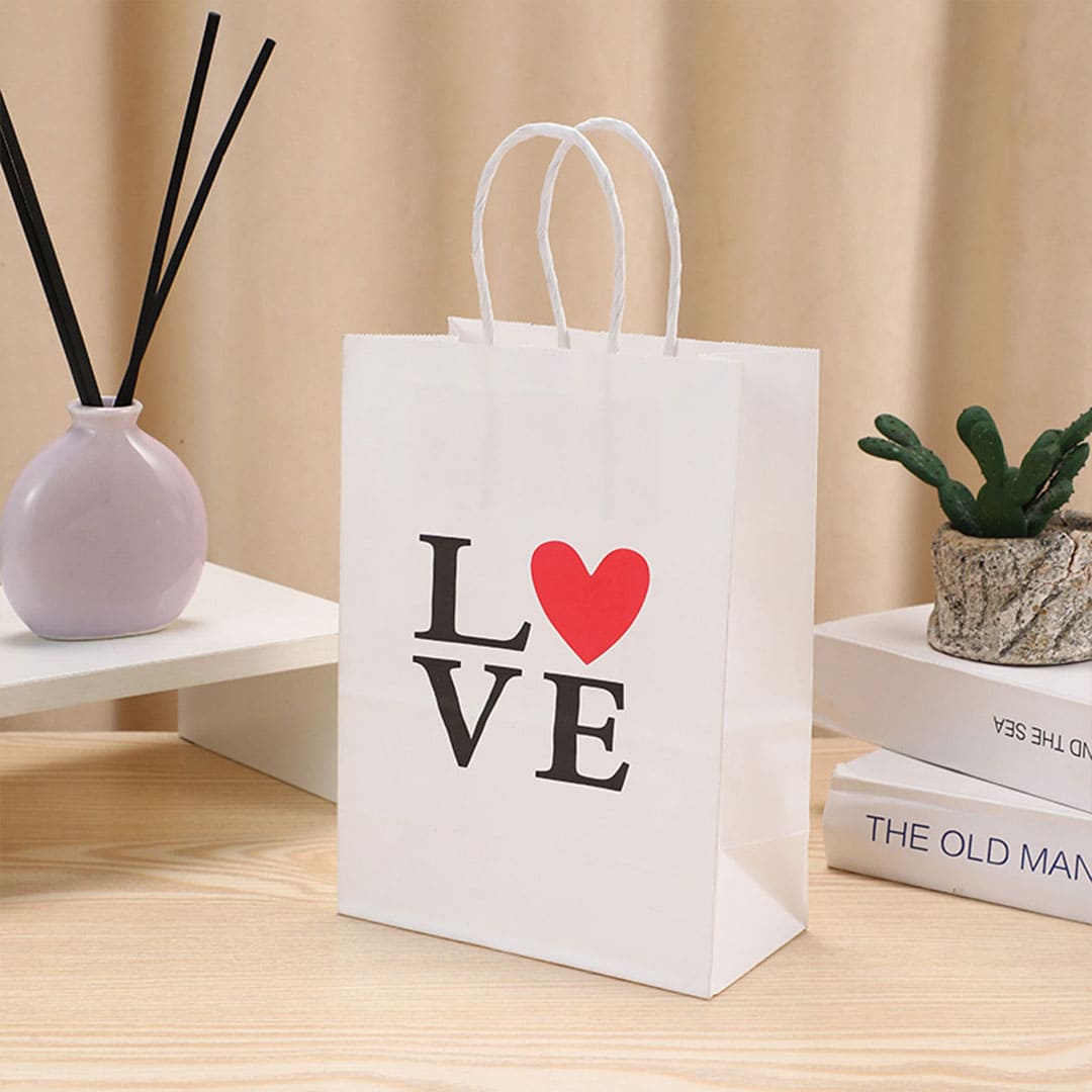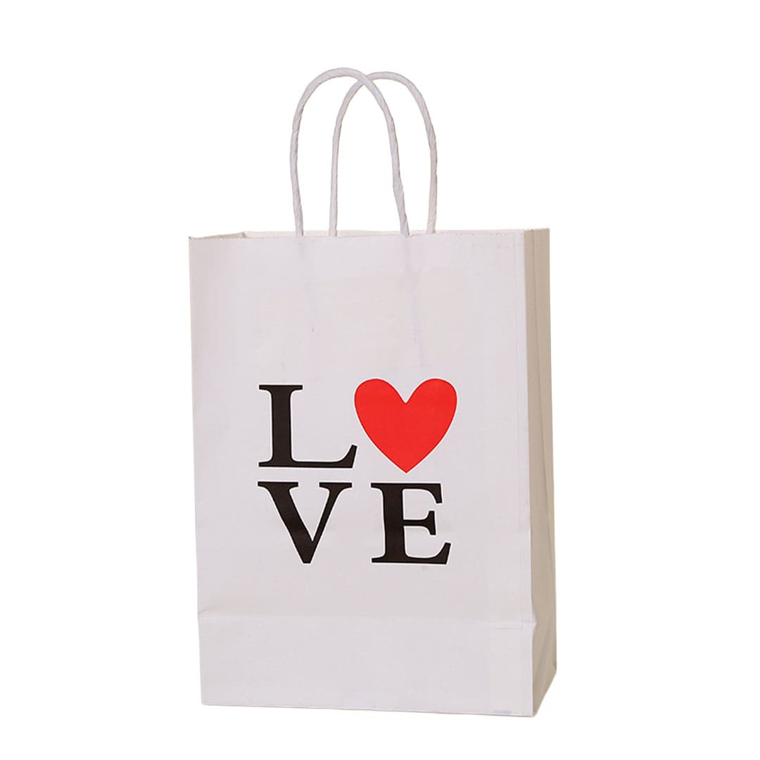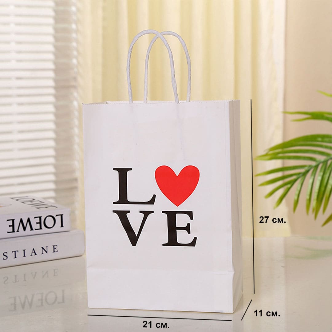 Білий паперовий подарунковий пакет з написом "Love", білі виті паперові ручки та плоске дно.