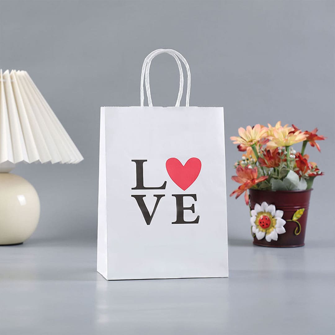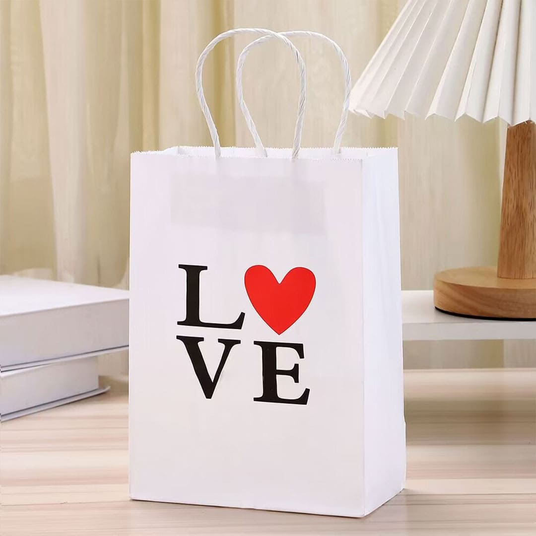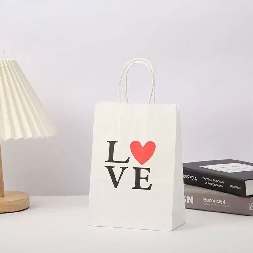 Білий паперовий подарунковий пакет з написом "Love", білі виті паперові ручки та плоске дно.