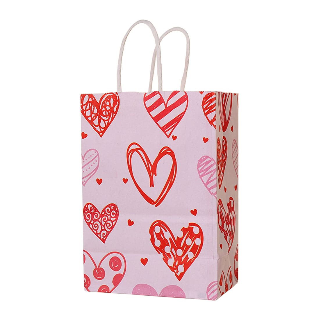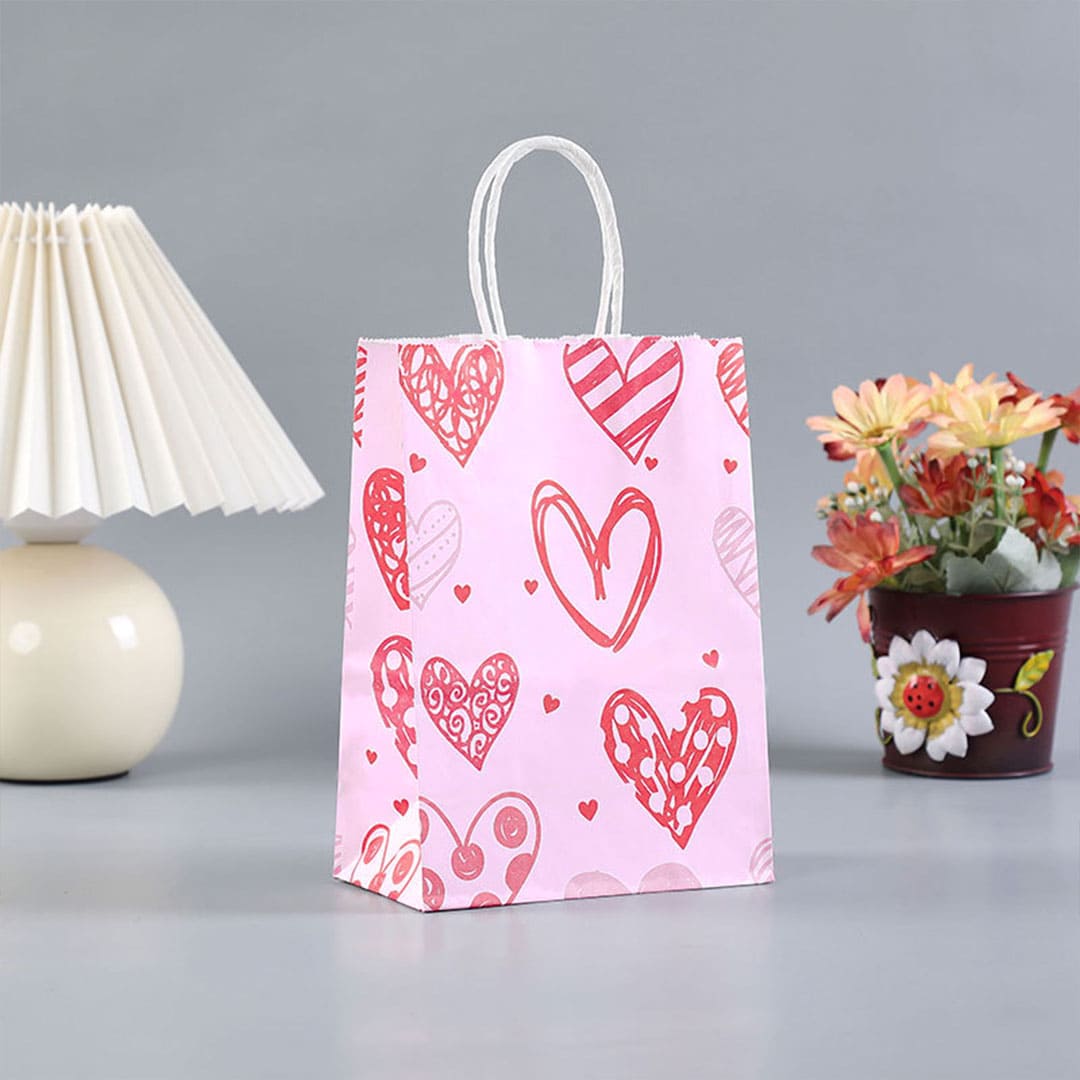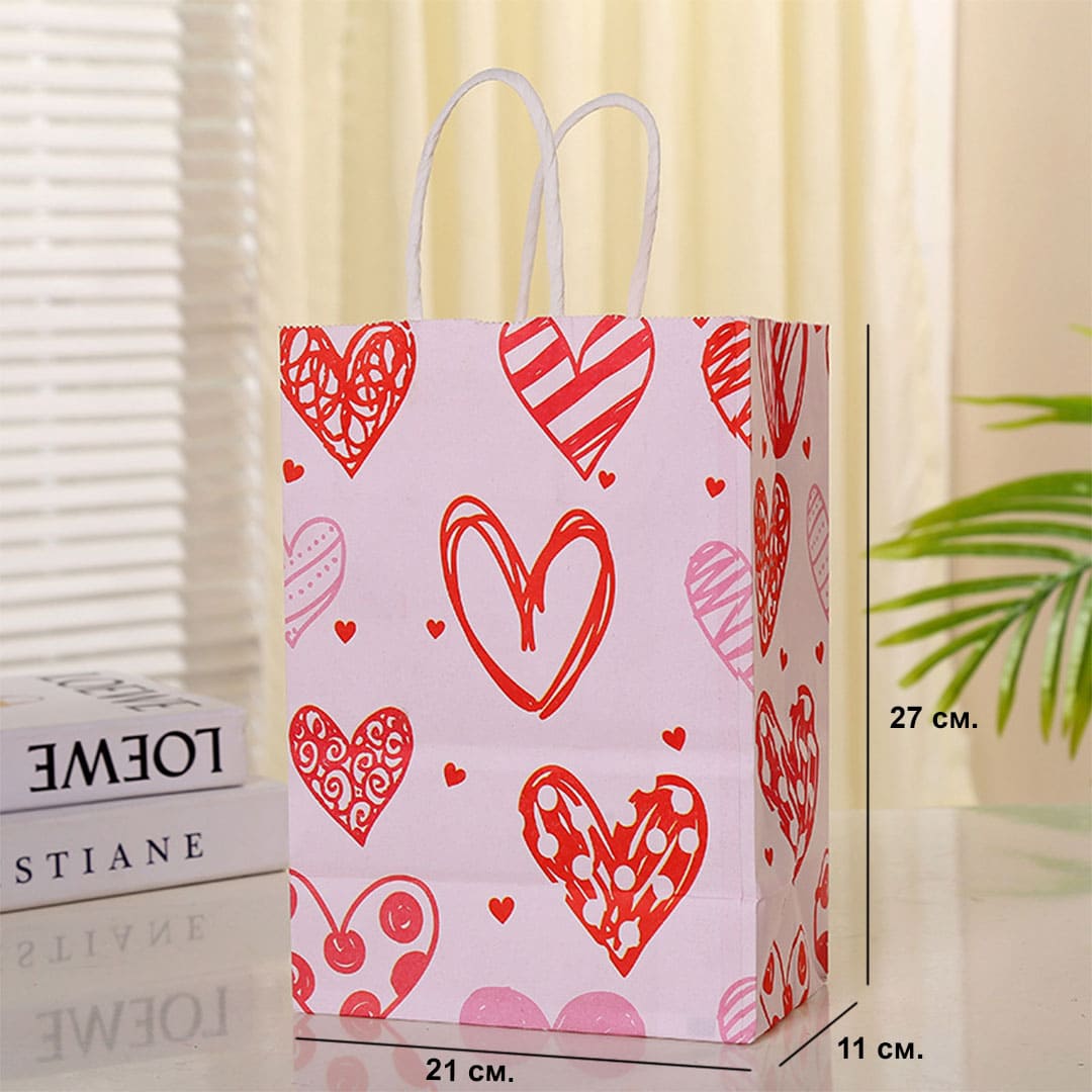 Рожевий паперовий подарунковий пакет з малюнком серця, білі кручені паперові ручки і плоске дно.