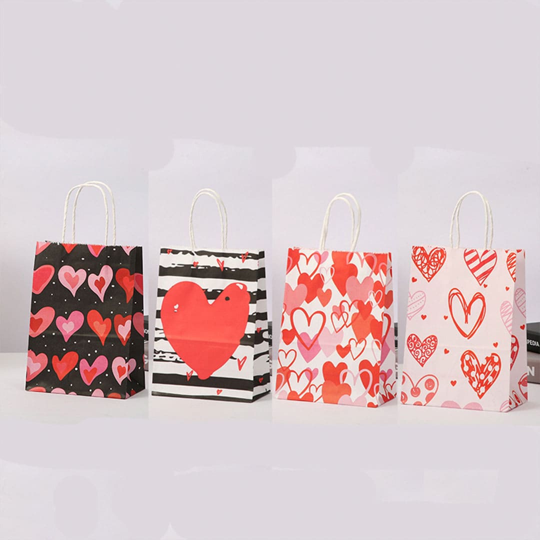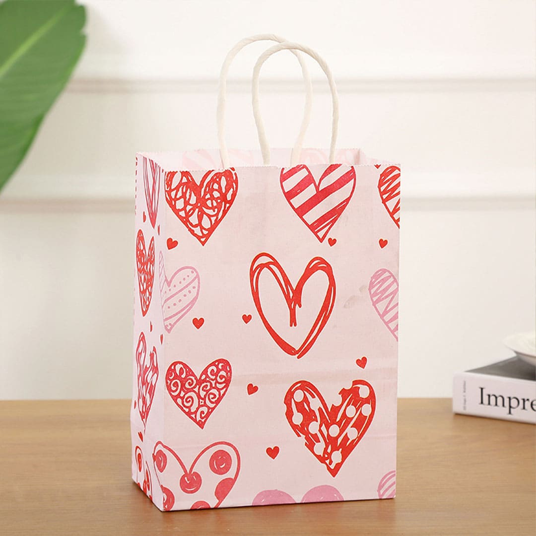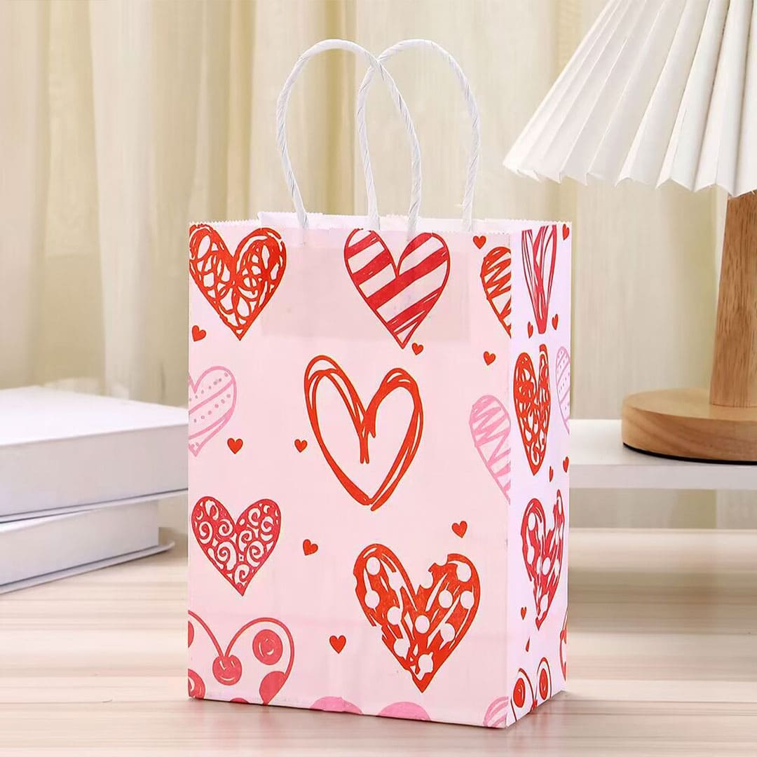 Рожевий паперовий подарунковий пакет з малюнком серця, білі кручені паперові ручки і плоске дно.