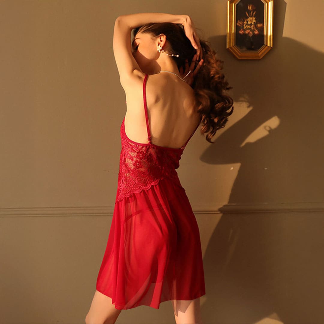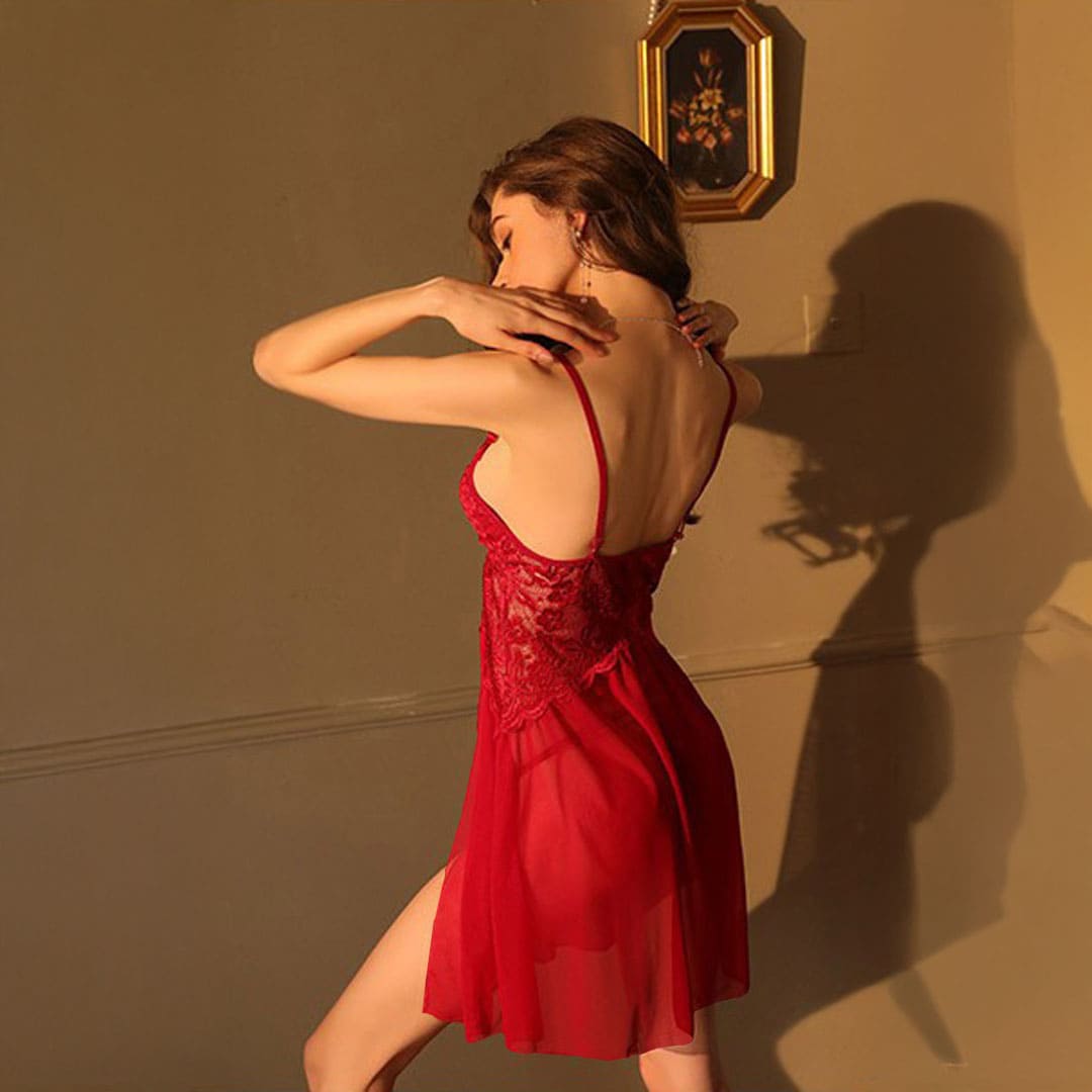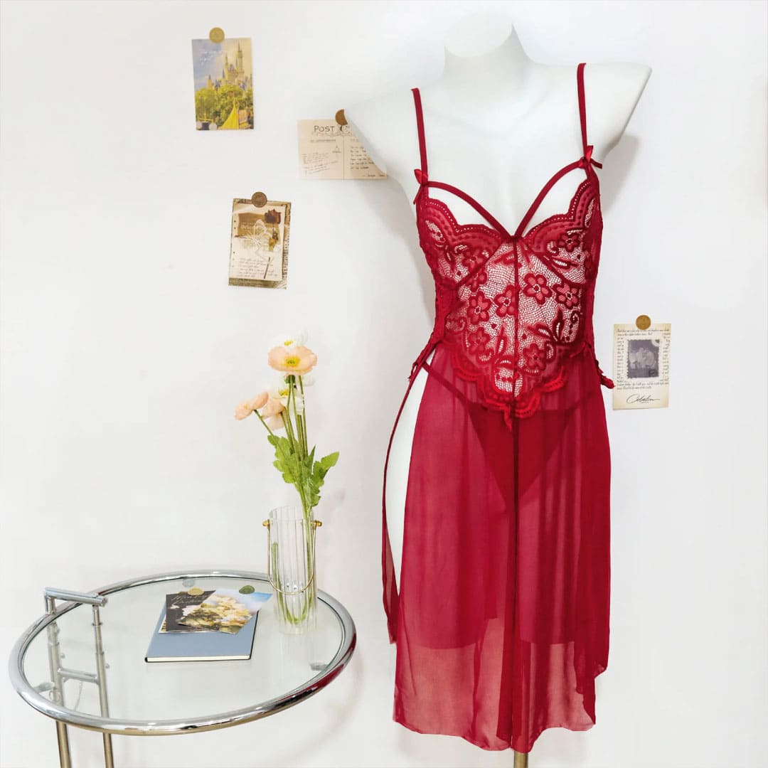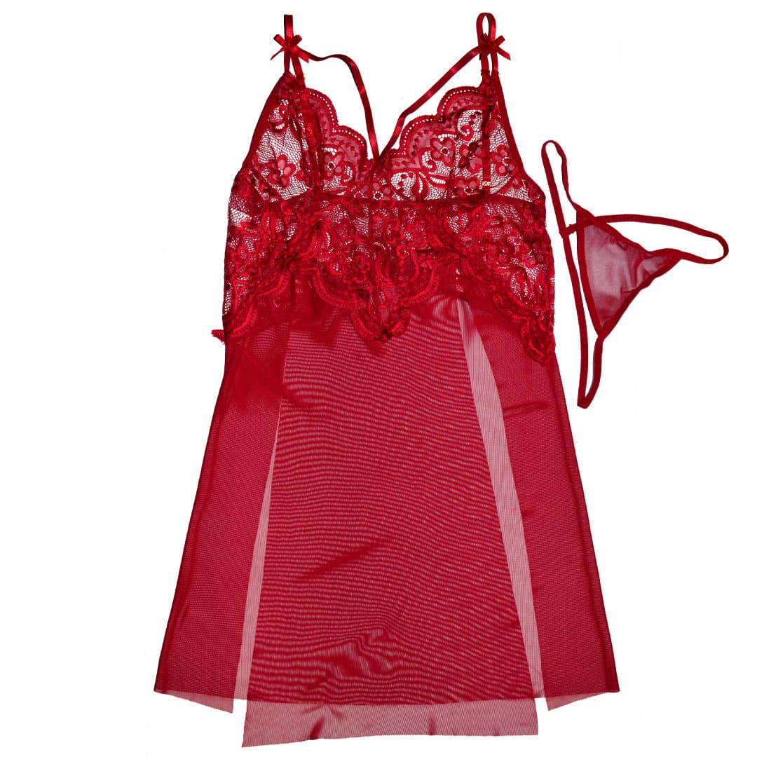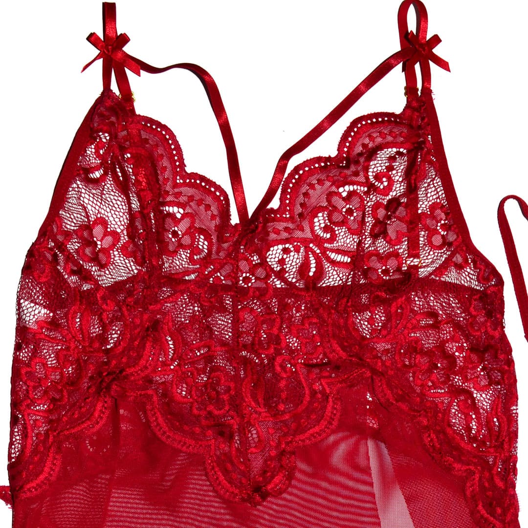 Прозорий пеньюар на тонких бретельках, що регулюються, з мереживними чашечками з додатковою гумкою з внутрішнього боку і маленькими бантиками, спереду під грудьми трикутні мереживні вставками і глибокі вирізи спереду з боків.
