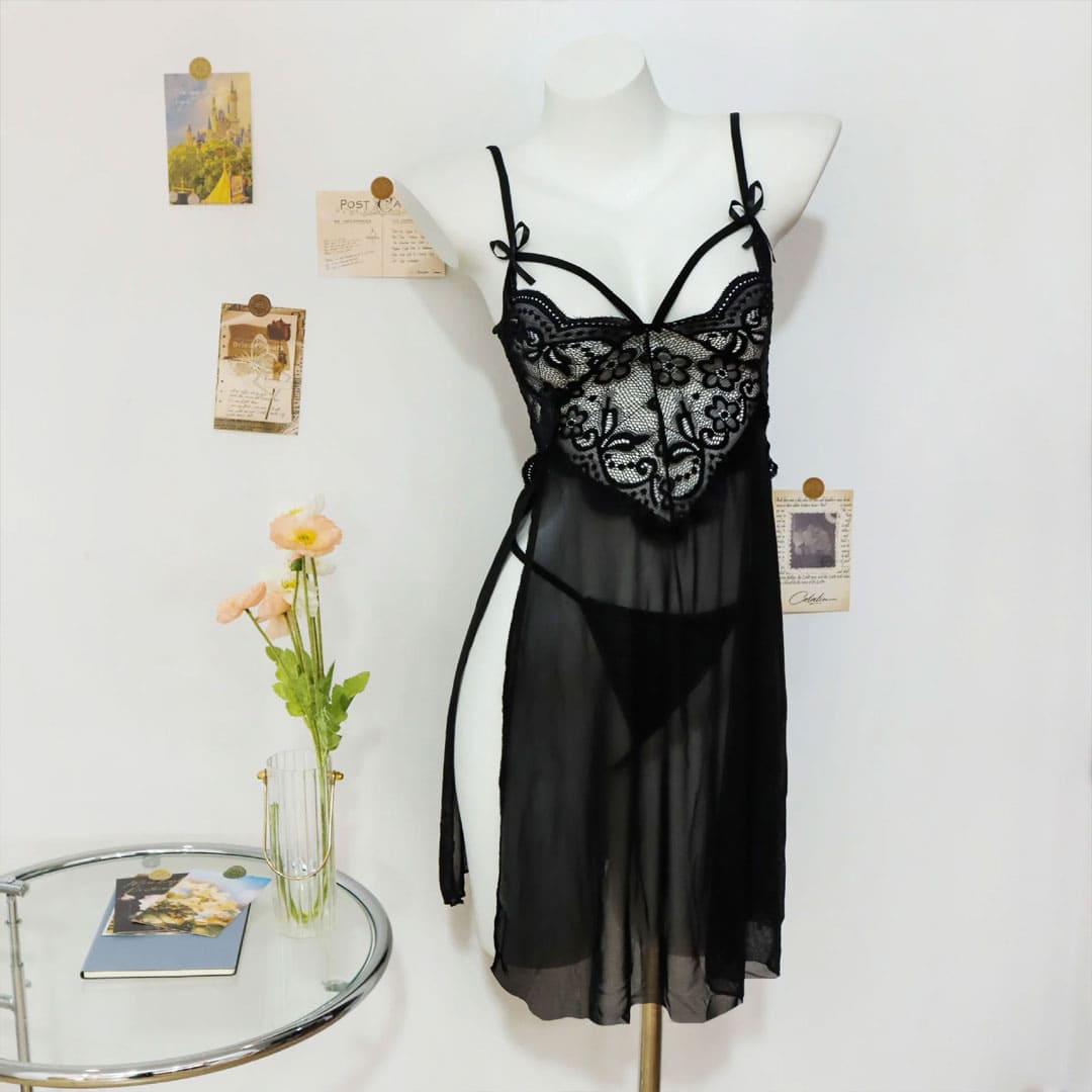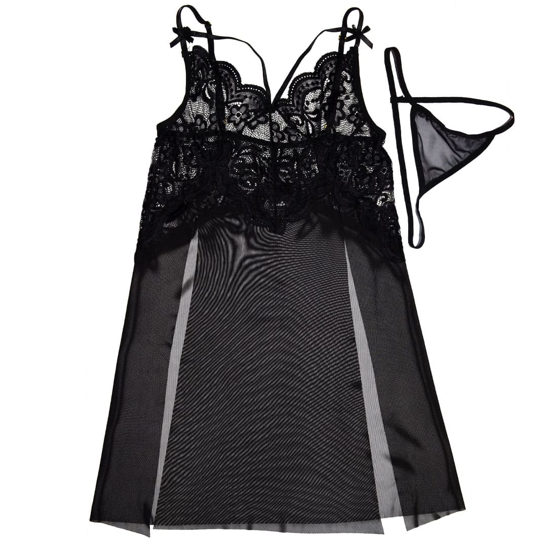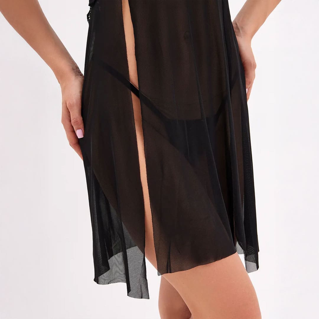 Прозорий пеньюар на тонких бретельках, що регулюються, з мереживними чашечками з додатковою гумкою з внутрішнього боку і маленькими бантиками, спереду під грудьми трикутні мереживні вставками і глибокі вирізи спереду з боків.