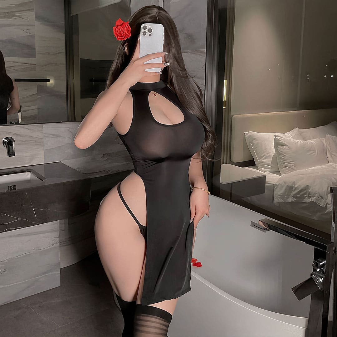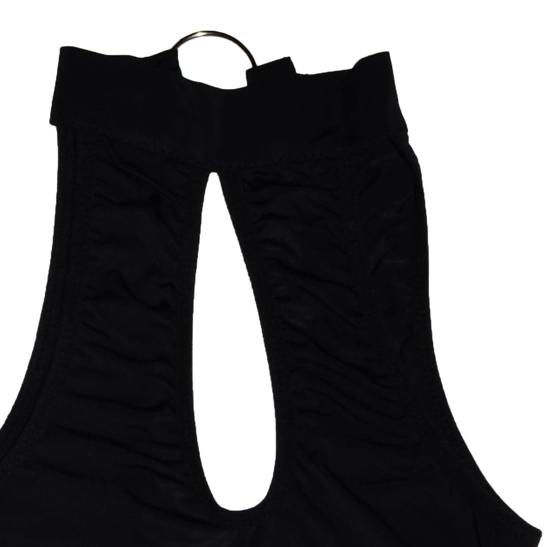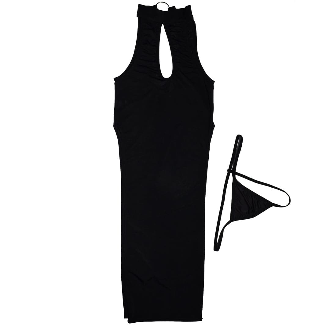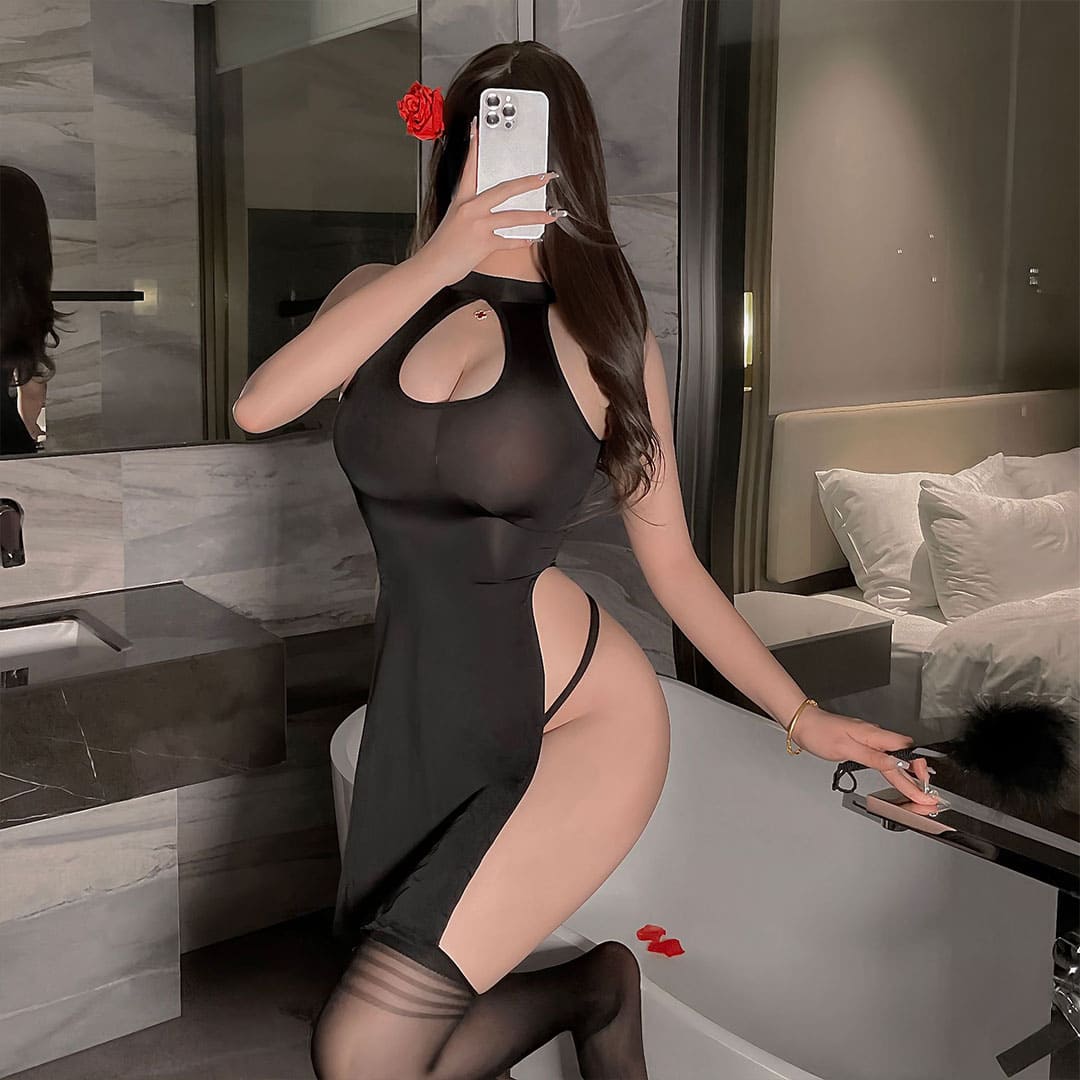 Чорний еротичний комплект (костюм для рольових ігор): пеньюар та труси з еластичного глянсового матеріалу.