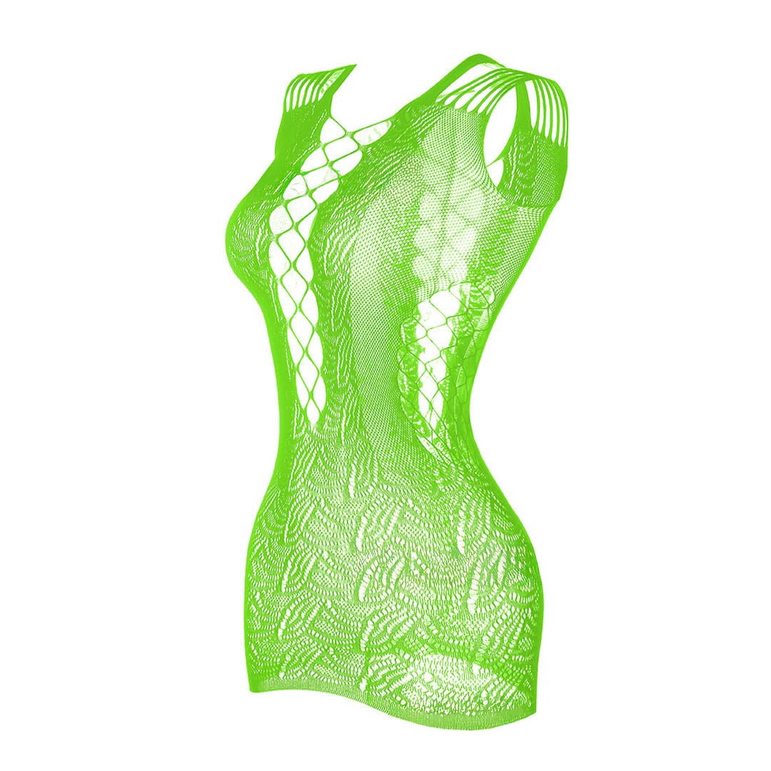 Еротичний прозорий короткий білий пеньюар "Сітка", що світиться в темряві салатовим в дрібну сіточку з ефектом люмінесценції (накопичує світло а потім світитися в темряві), на семи тонких бретельках з'єднаних зверху; спереду, ззаду і з боків вирізи кола, внизу сітка з орнаментом.