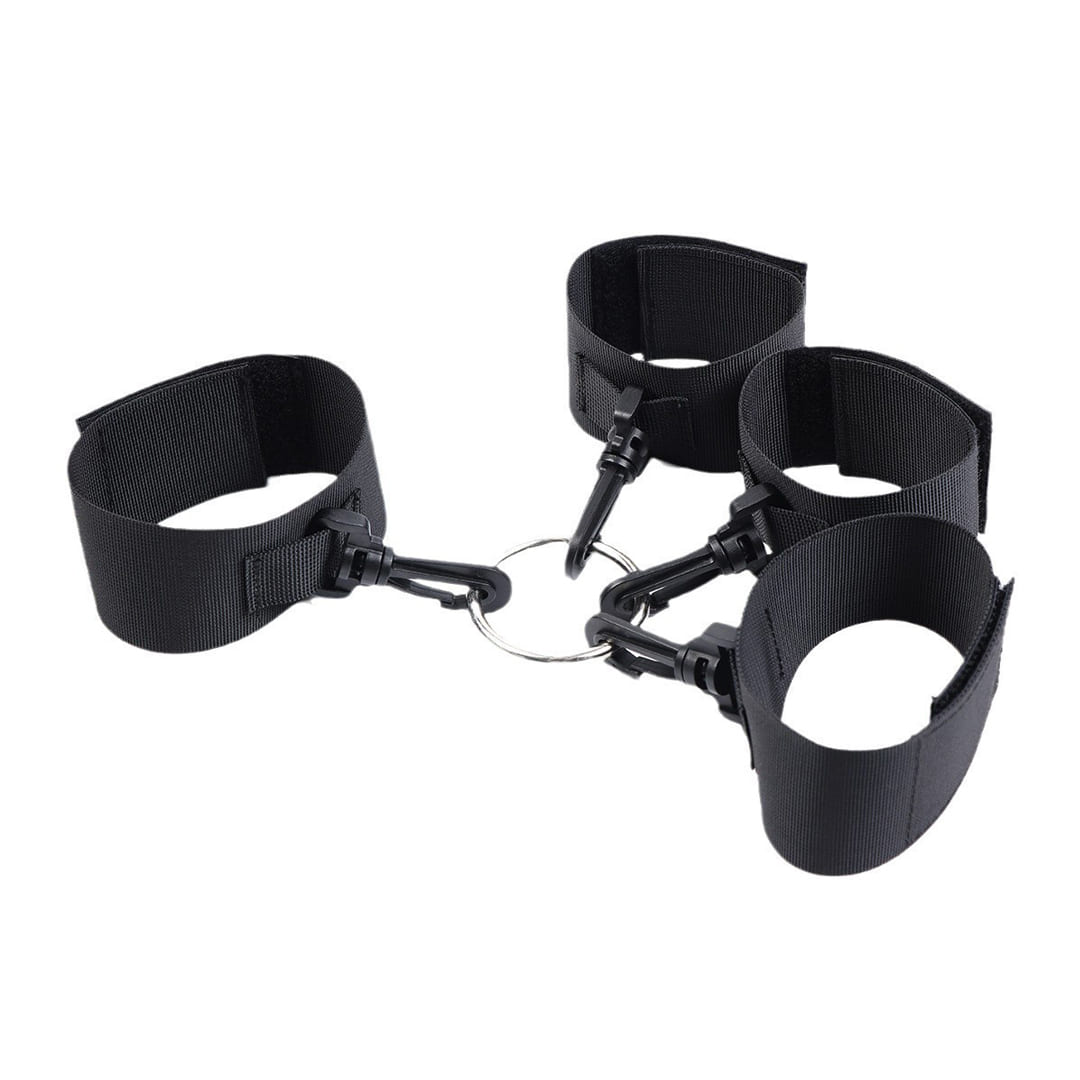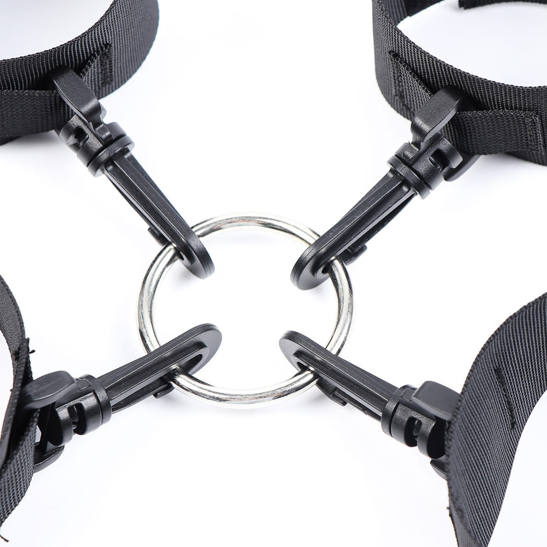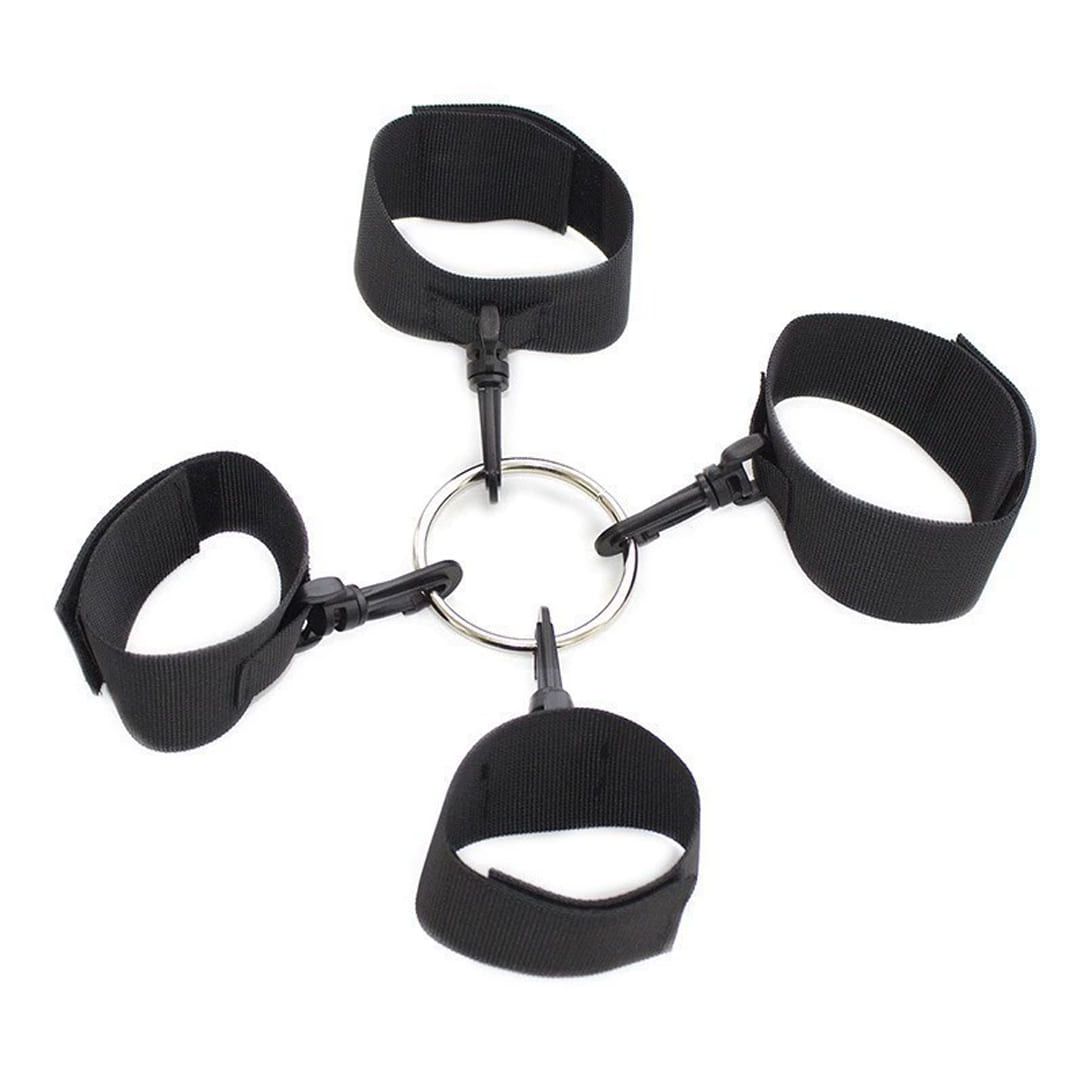 Практический аксессуар для фиксации, обеспечивающий контроль и разнообразие во время ролевых игр. Комплект состоит из наручников и поножей, соединенных между собой карабином к центральному металлическому кольцу.