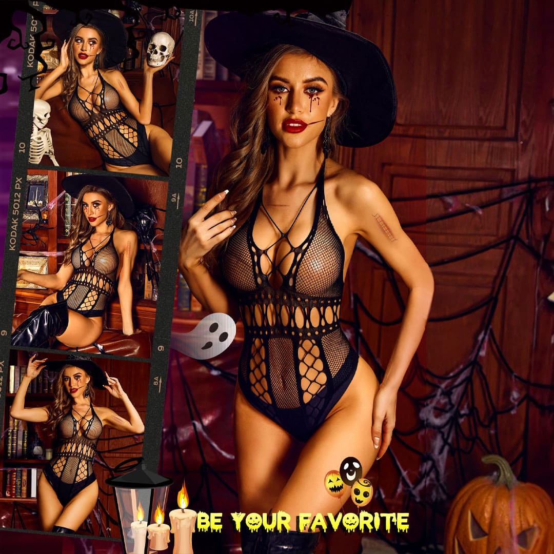 Эротический прозрачный Боди "Сетка" (игровой костюм, костюм для ролевых игр) в очень мелкую сетку через шею, спереди сверху имитация портупеи, под грудью вырезы круги и овалы, спереди и сзади по бокам вырезы ромбы.