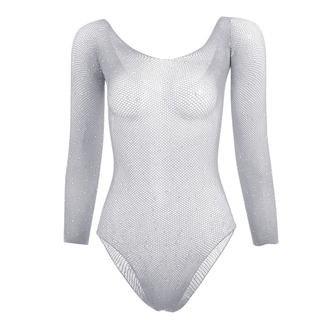 Эротический серый прозрачный Боди "Сетка" (игровой костюм, костюм для ролевых игр) в мелкую сеточку с приклеенными стразами, длинные рукава и широкий круглый вырез горловины спереди и сзади (можно носить с открытыми плечами), сзади трусы - слипами.