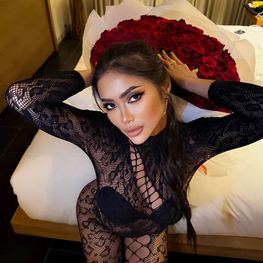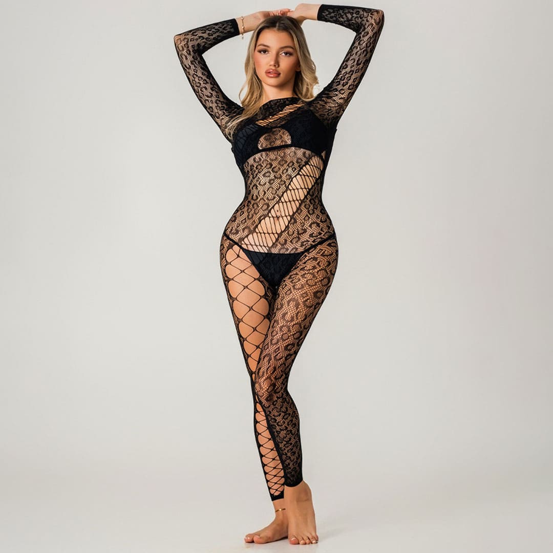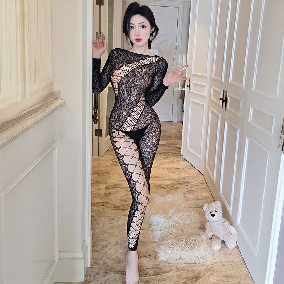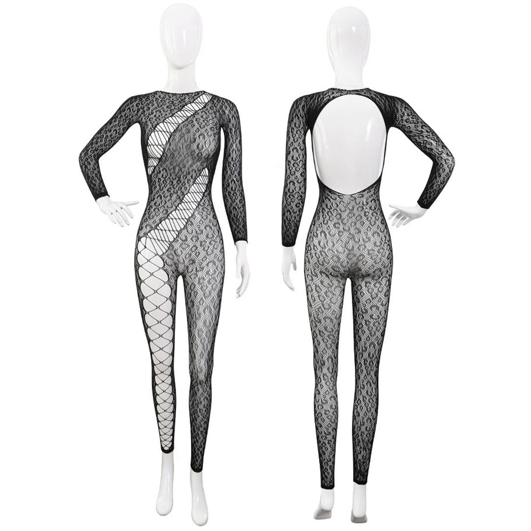 Эротический прозрачный БодиСтокинг (Боди комбинезон Сетка, игровой костюм, костюм для ролевых игр) с рисунком в стиле "Сафари" (леопардовый принт) с круглым вырезов горловины и длинным рукавам, украшен вырезами спереди и на одной ноге, на спине большой овальный вырез, открытая стопа.