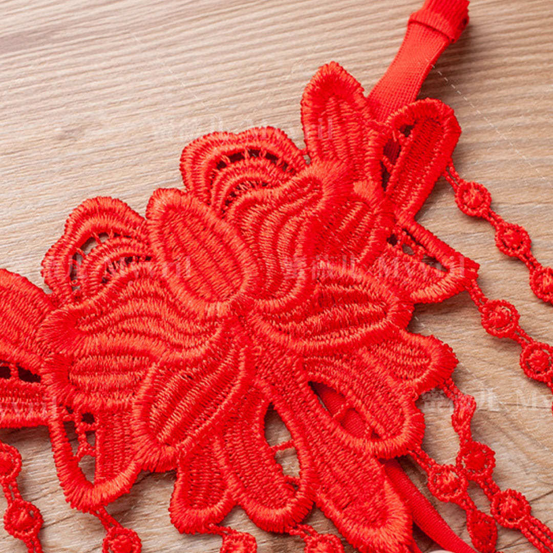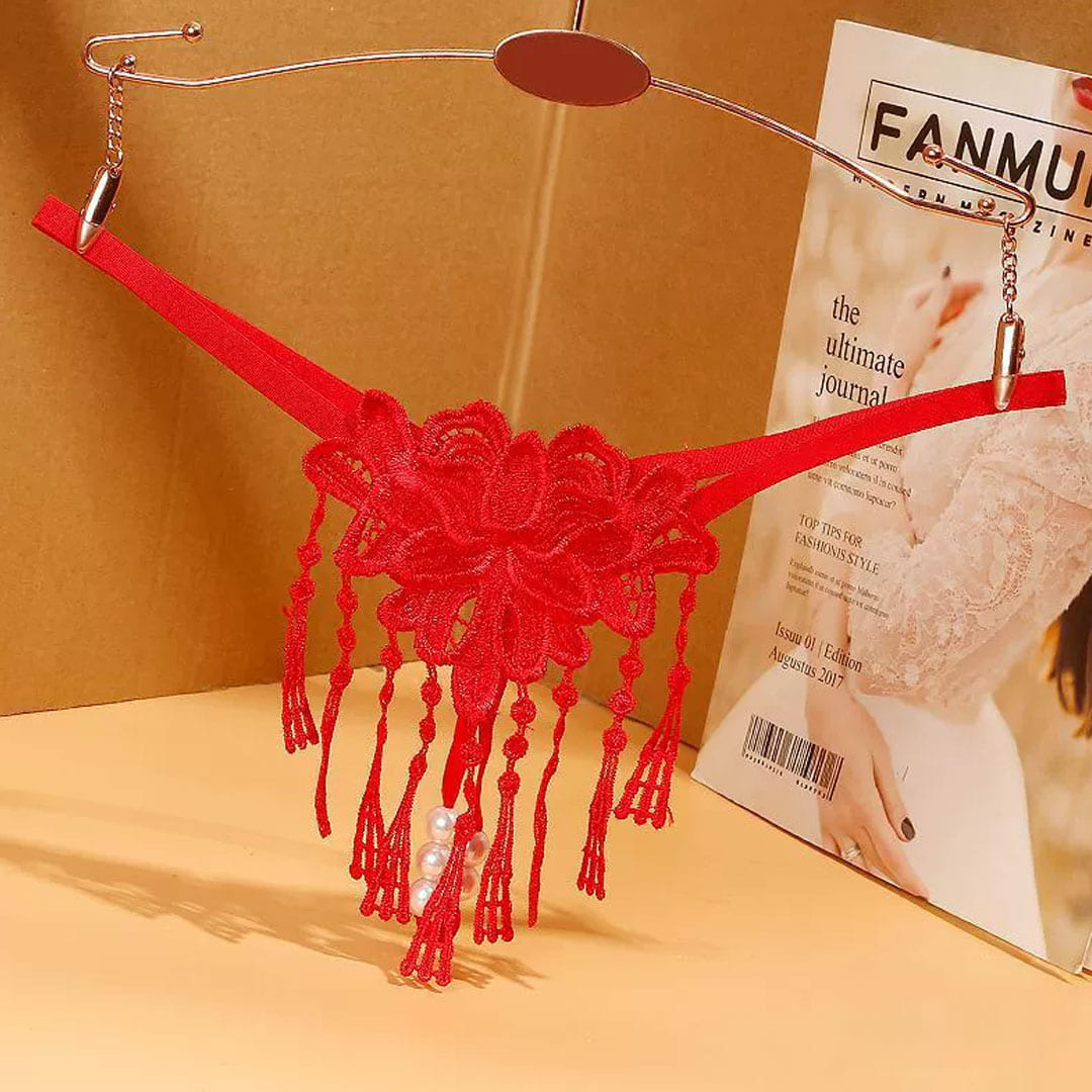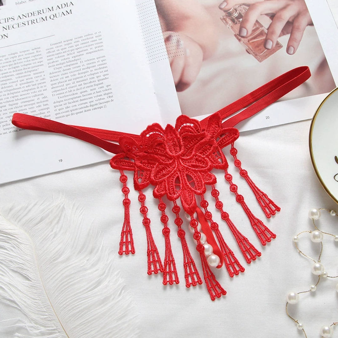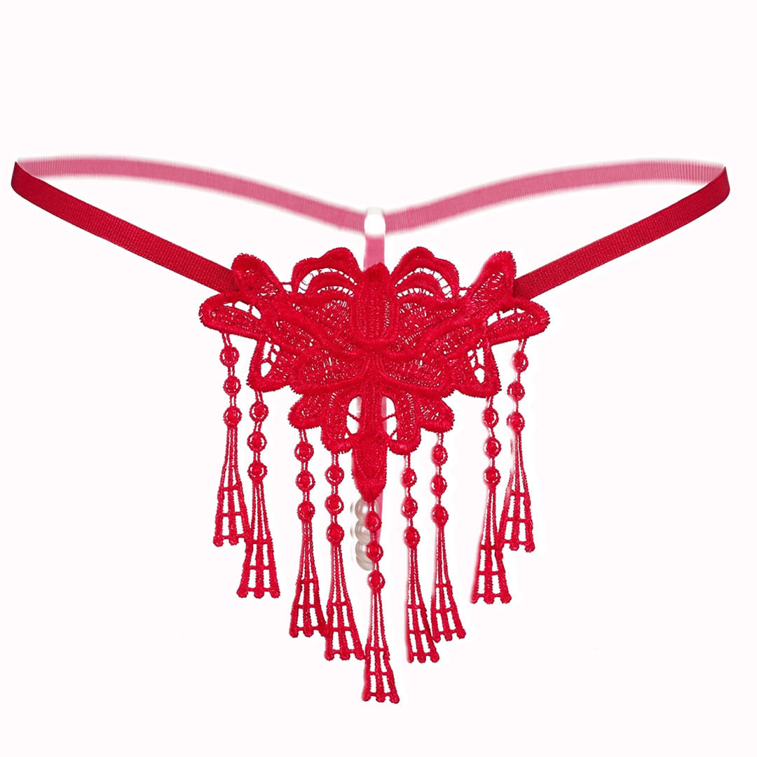 Красные кружевные трусики с жемчужной нитью и декоративными подвесами (бахромой).