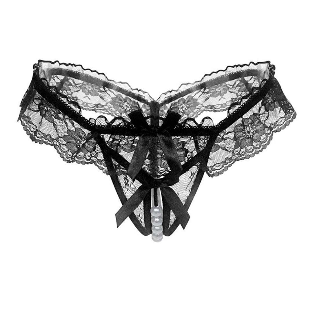 Черные кружевные трусики с бантиком и жемчужной нитью
