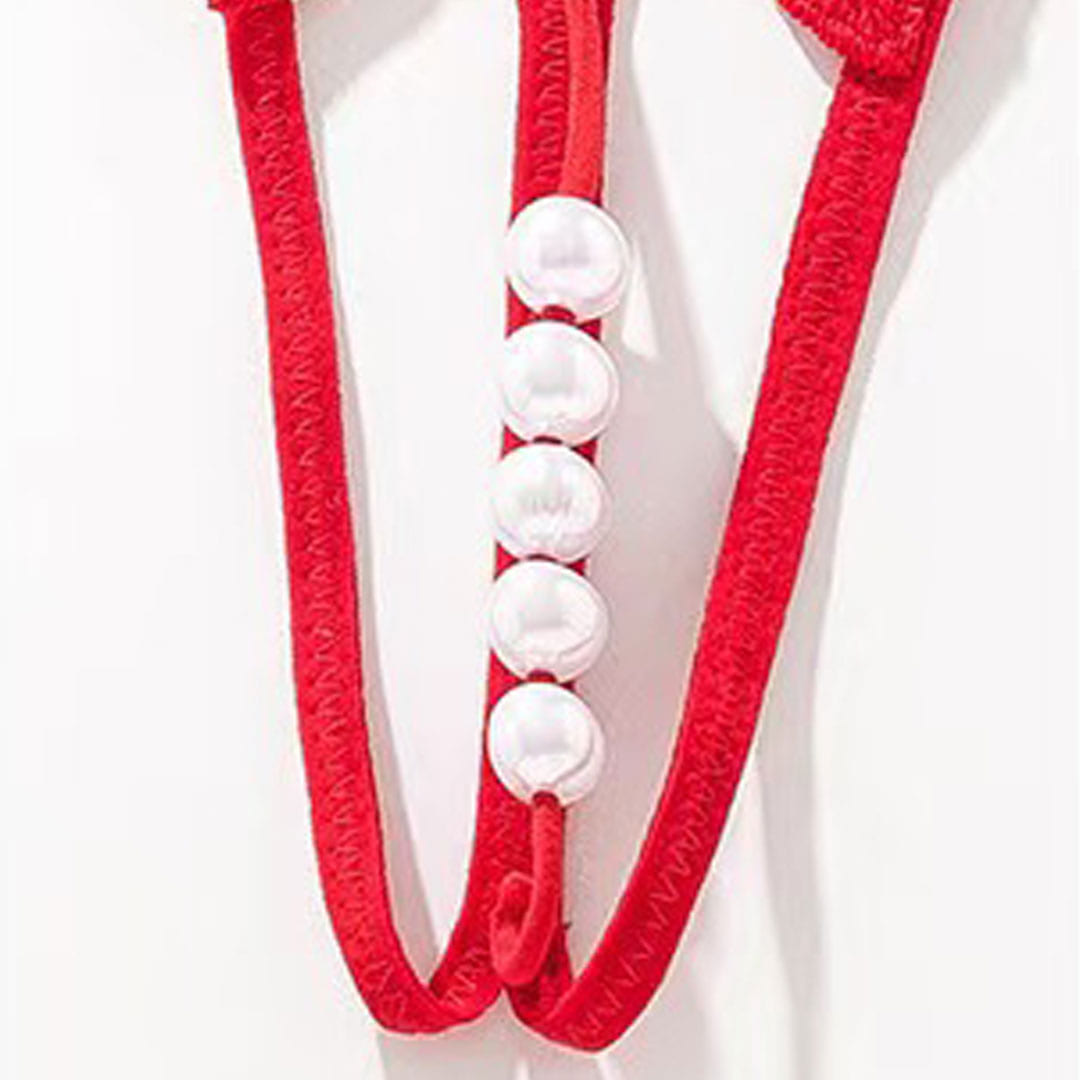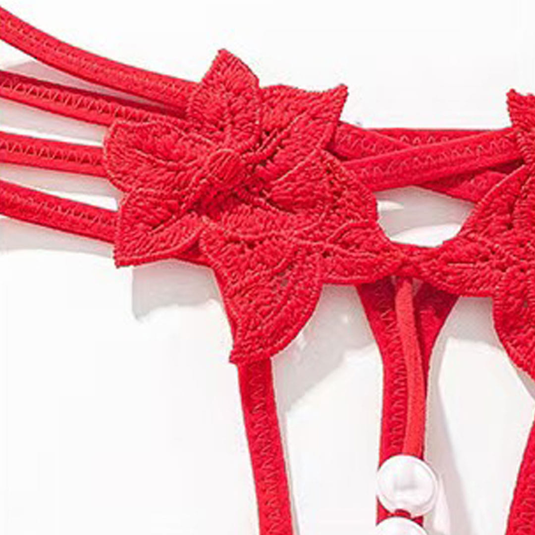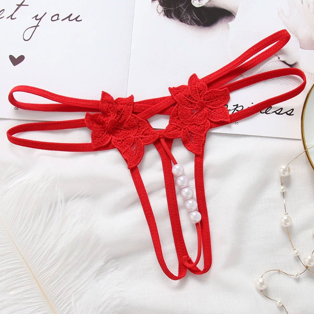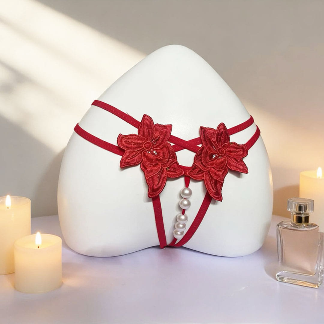 Красные эротические трусы черного цвета с декоративными цветами, в центре вставка из жемчужин.