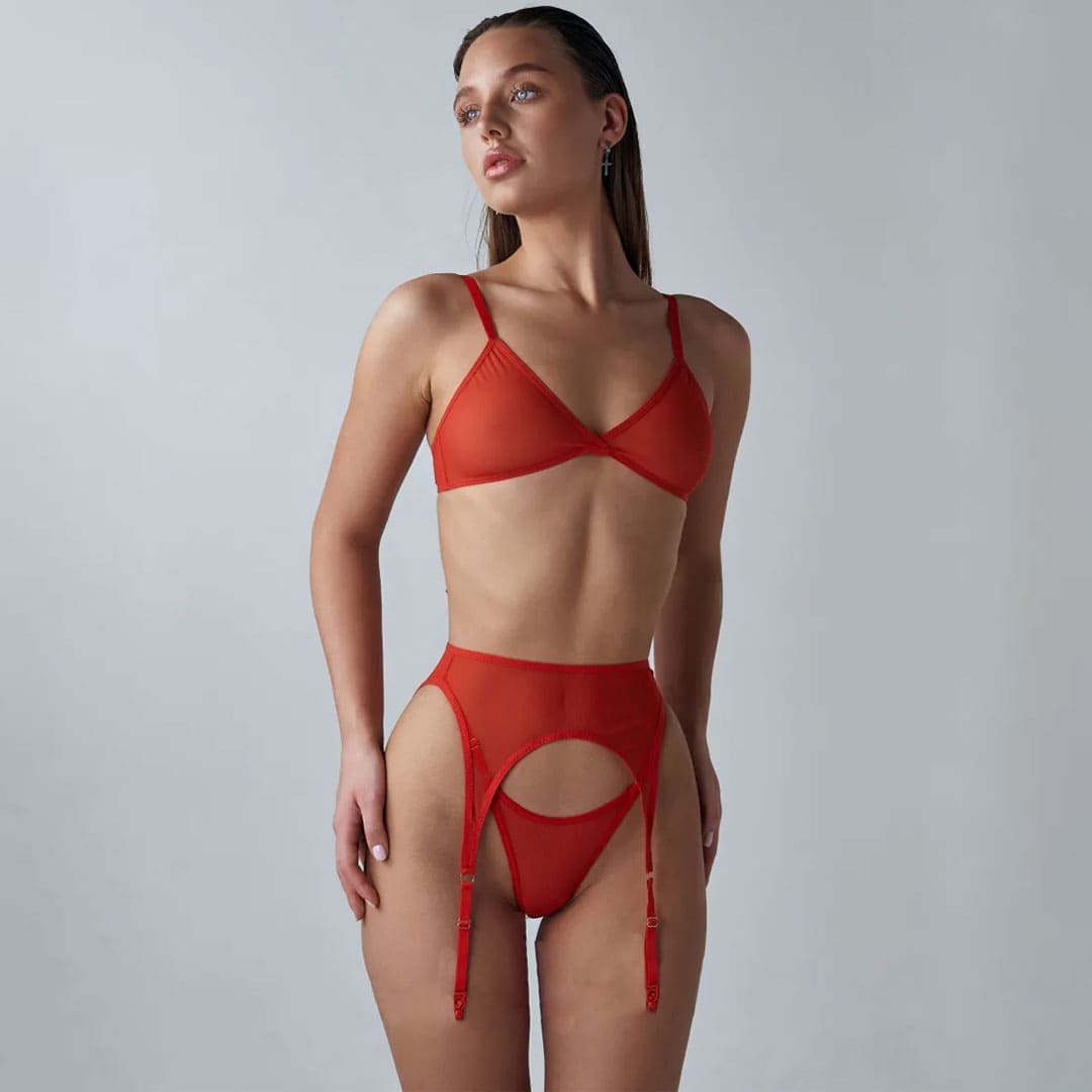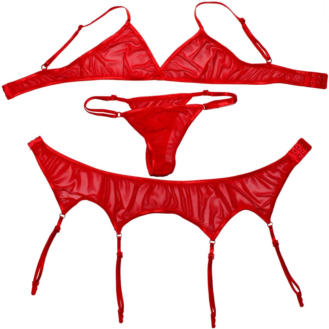 Красный полупрозрачный эротический комплект (игровой костюм, костюм для ролевых игр): бюстгальтер, трусы и пояс.
