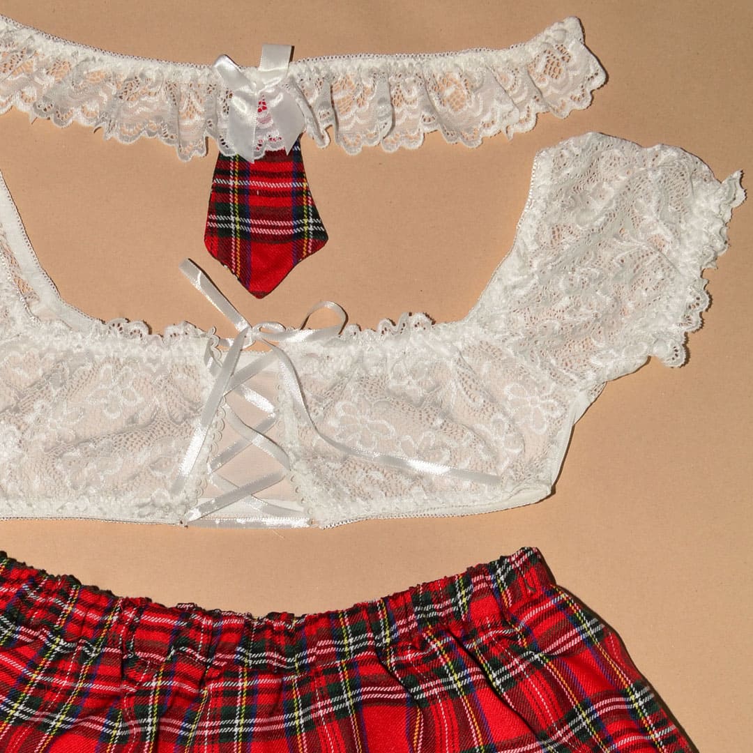 Эротический игровой костюм "Школьница" (костюм для ролевых игр): топ, юбка, трусы, воротник с галстуком.