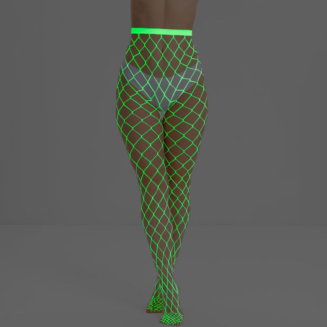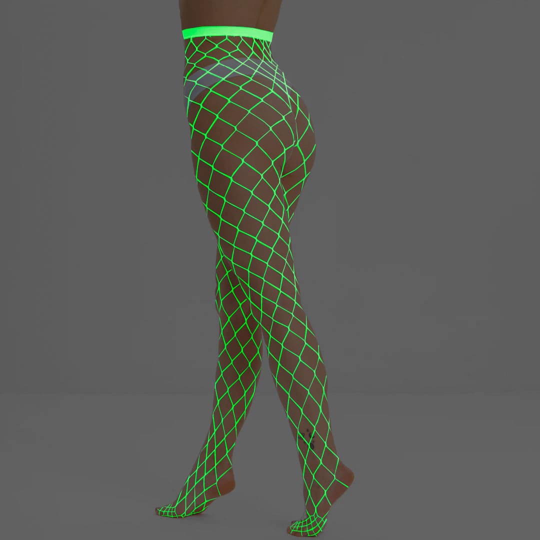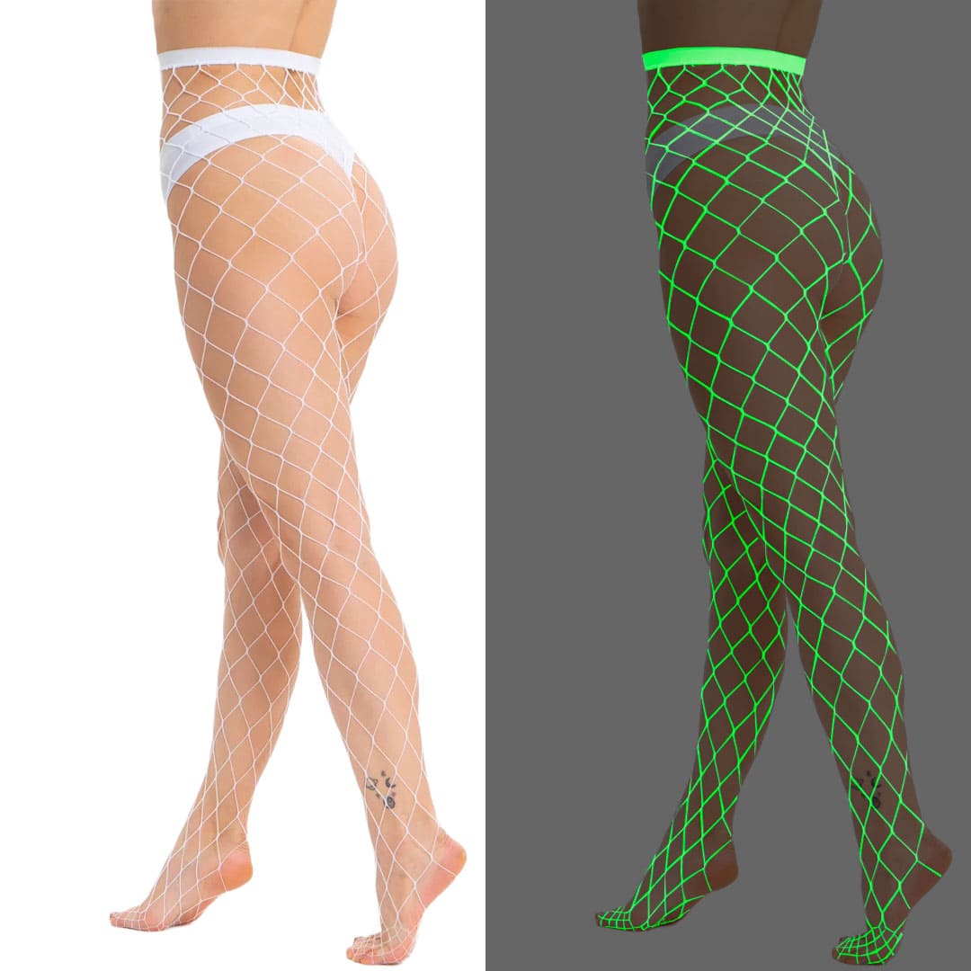 Колготки белые светящиеся в темноте салатовым в крупную сетку с поясом-резинкой и с эффектом люминесценции (накапливает свет а потом светиться в темноте).