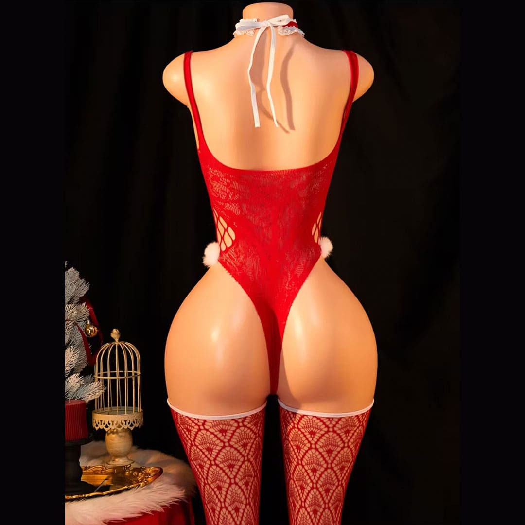 Эротический новогодний игровой костюм (костюм Снегурочки, костюм для ролевых игр): боди "Сетка", чулки, кружевной чокер на шею.