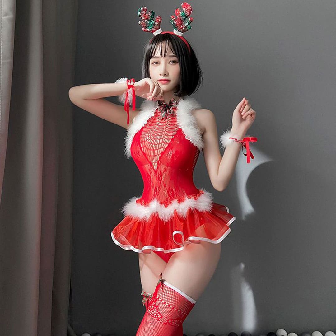 Эротический новогодний игровой костюм (костюм Снегурочки, костюм для ролевых игр): боди "Сетка", чулки и меховые манжеты на руки.