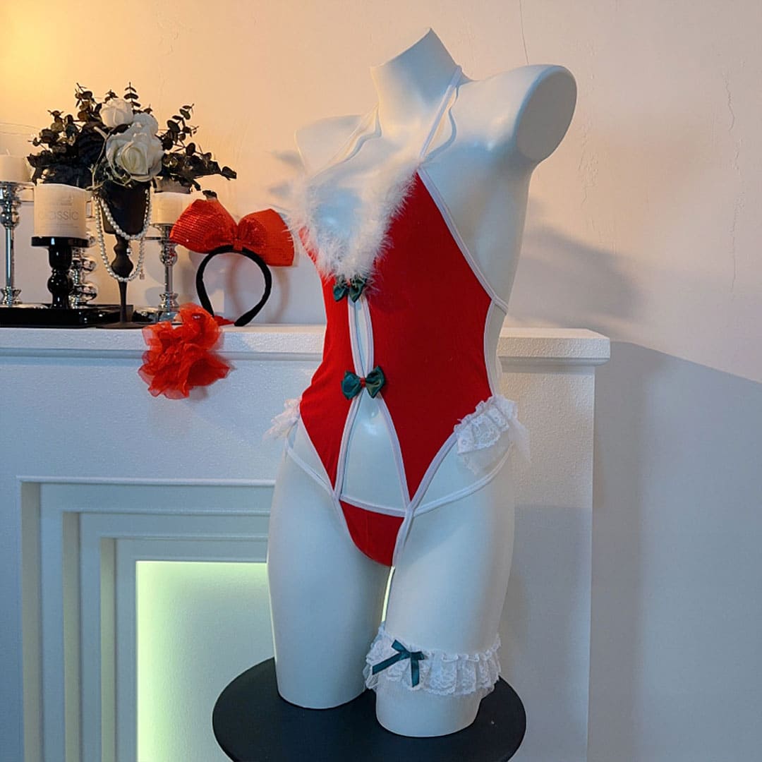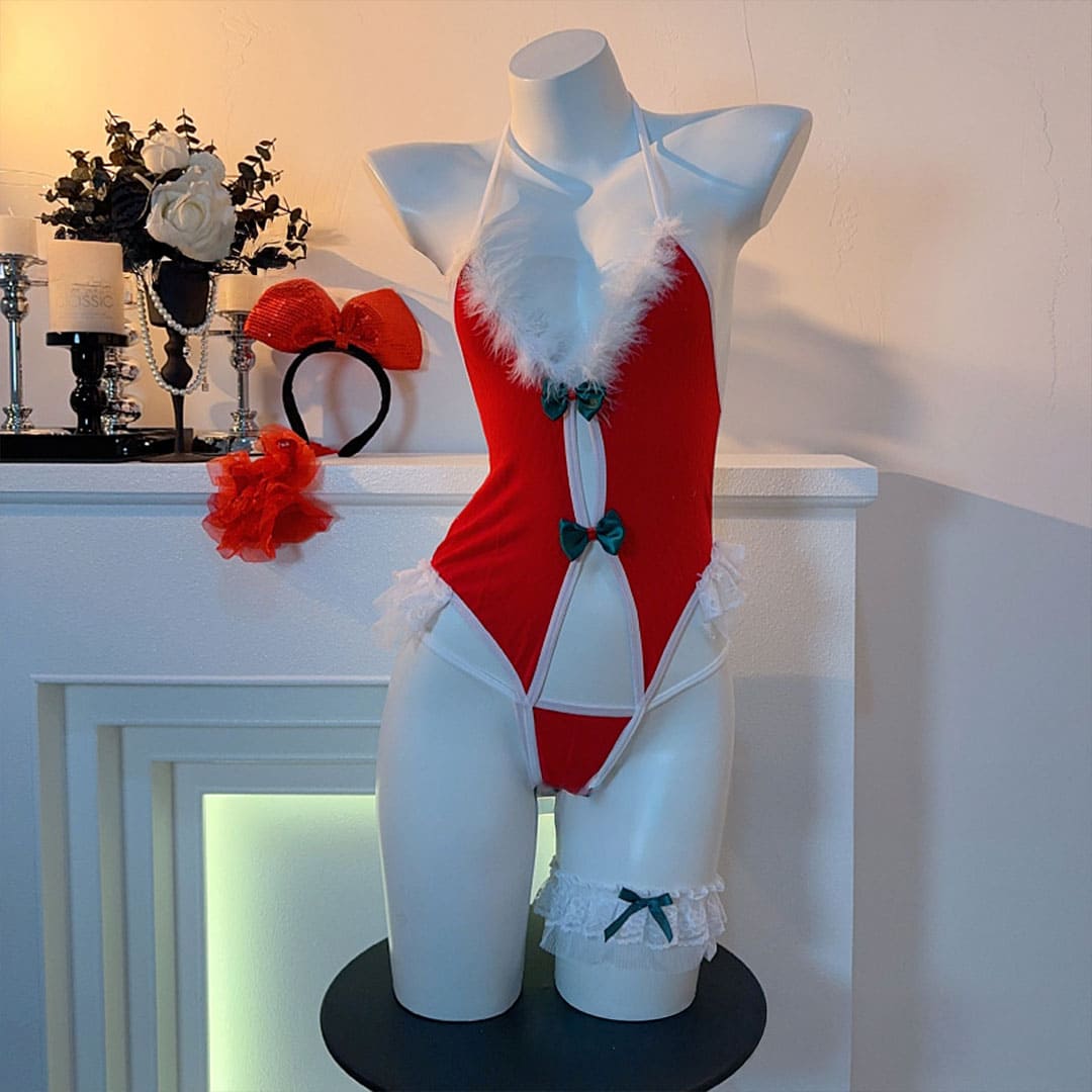 Эротический новогодний игровой костюм (костюм Снегурочки, костюм для ролевых игр): боди "Сетка", трусы и кружевная повязка на ногу.
