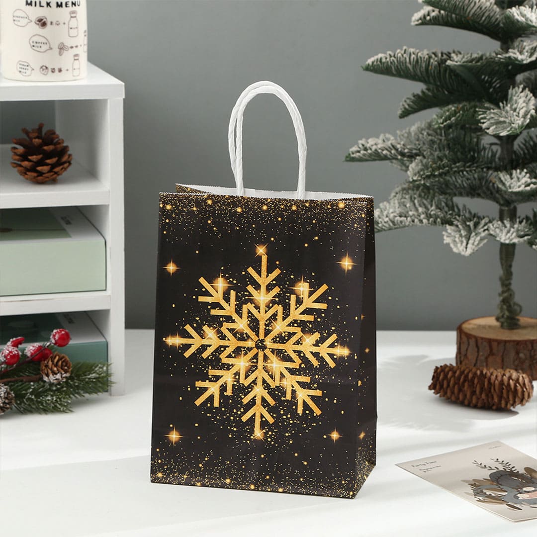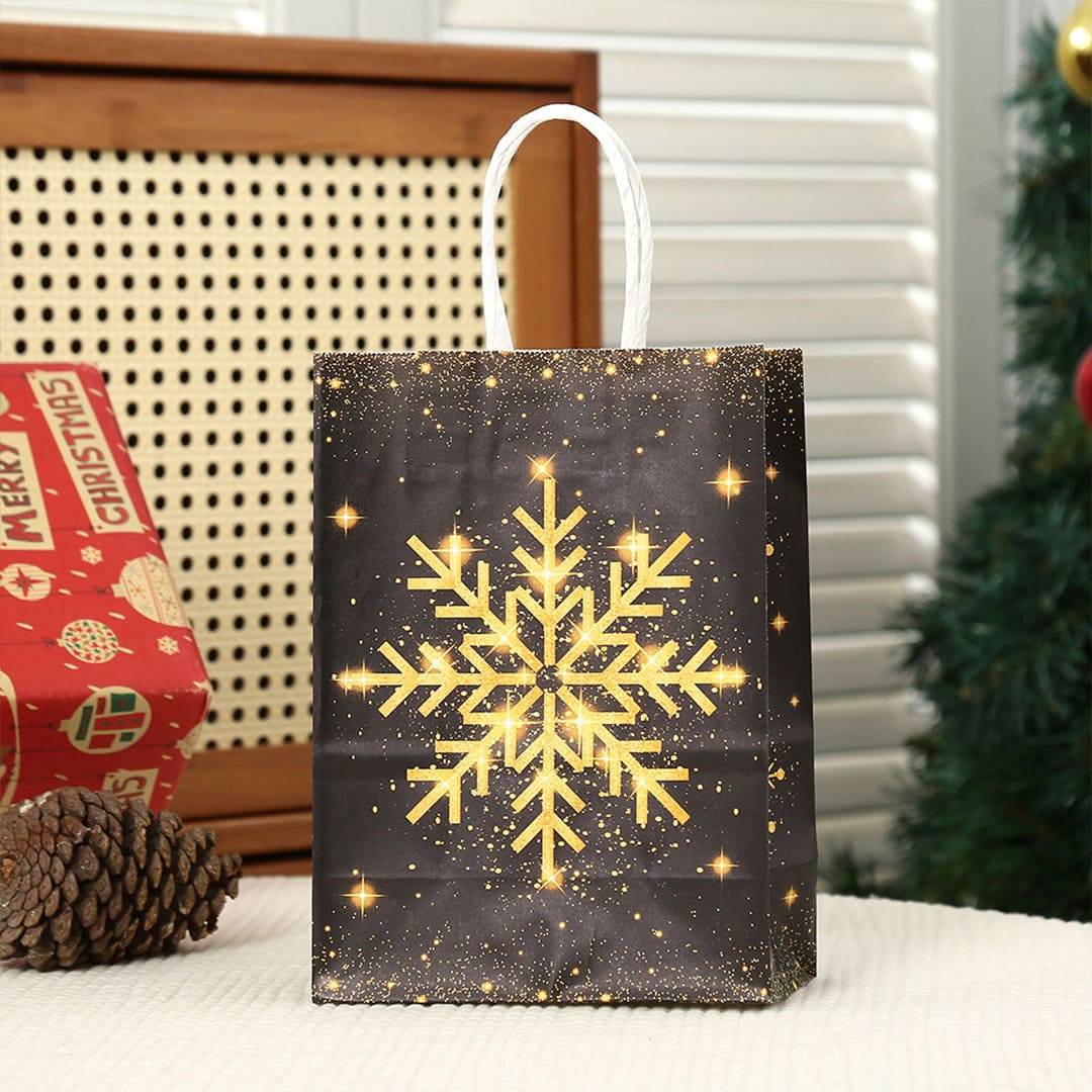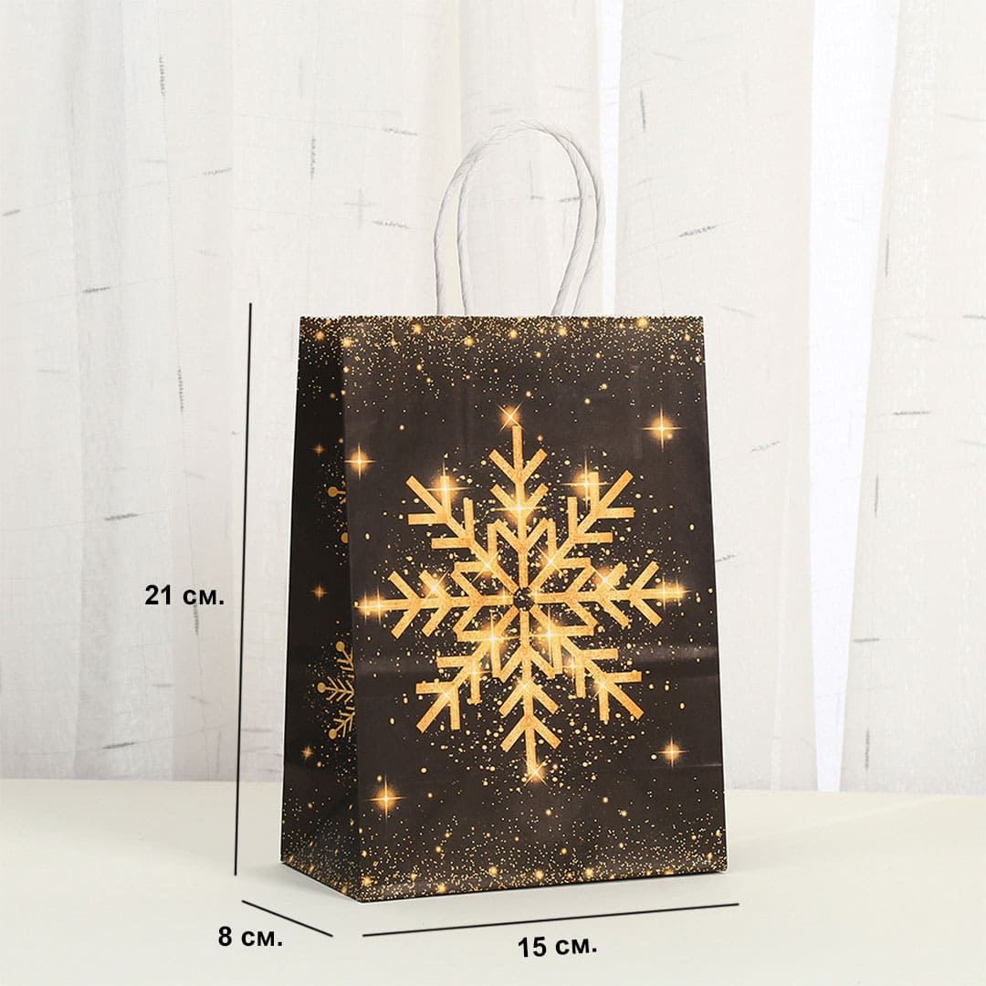 Новогодний бумажный подарочный пакет с желто-оранжевым рисунком снежинка, витые белые бумажные ручки и плоское дно.