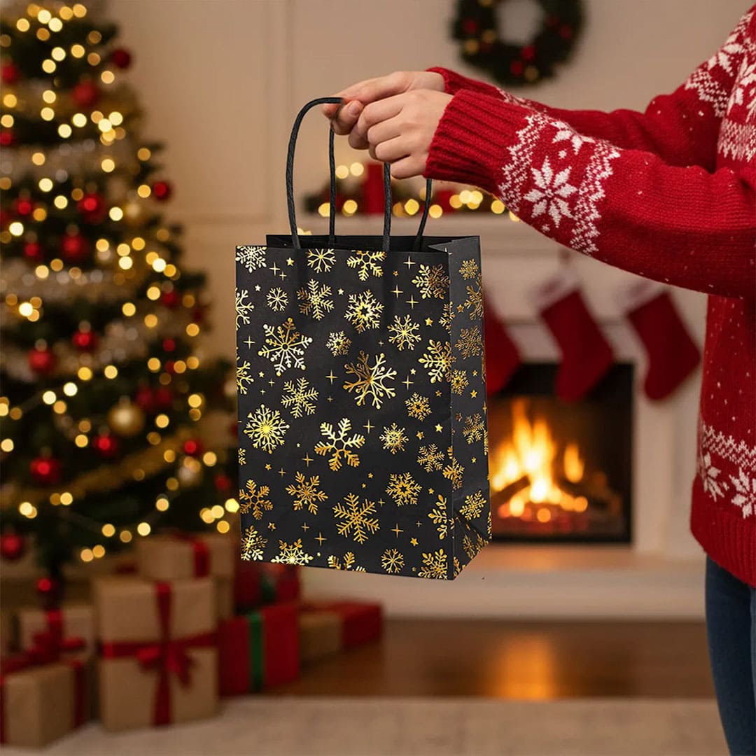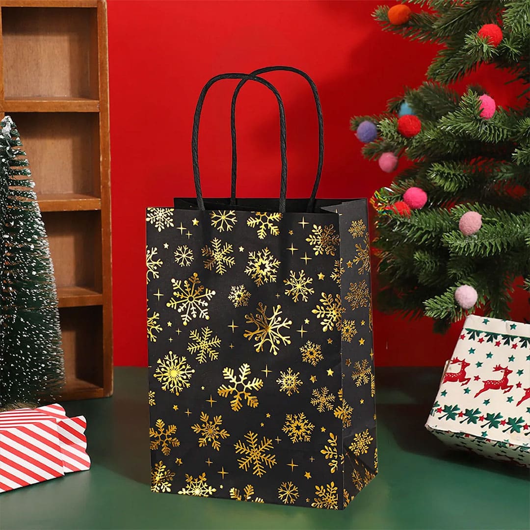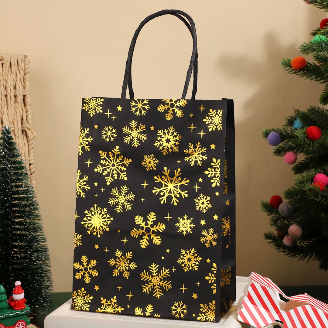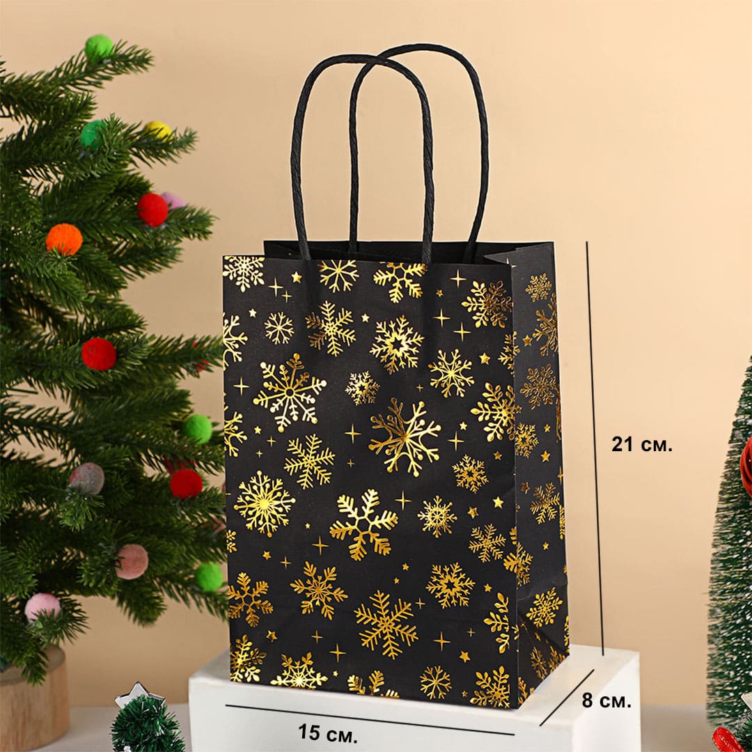 Новогодний бумажный подарочный пакет с золотистым рисунком снежинки, витые бумажные ручки и плоское дно.