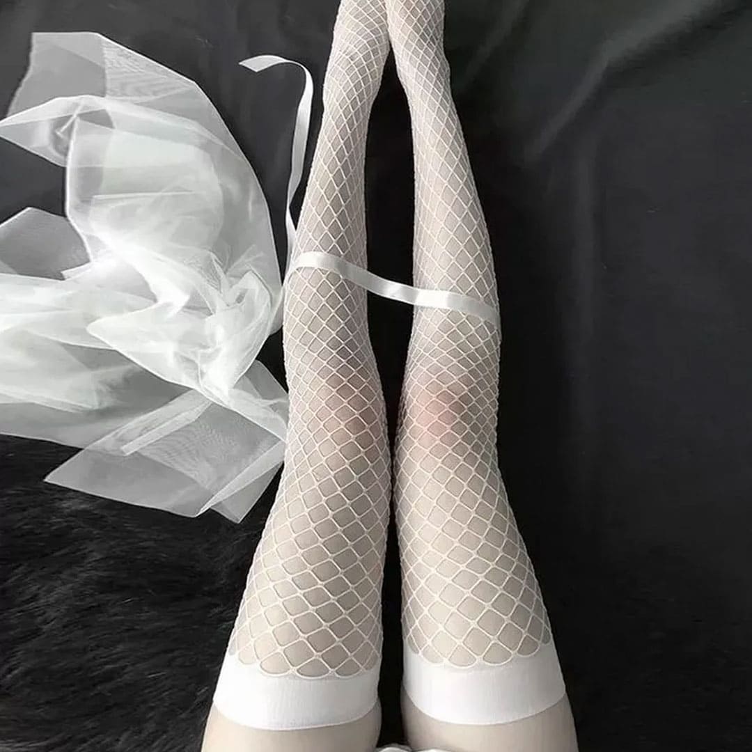 Чулки белые выполнены в сеточке, что красиво подчеркивает форму ног и придает легкость силуэт. Сверху модель украшена белой полоской, создающей изящный и романтичный акцент.