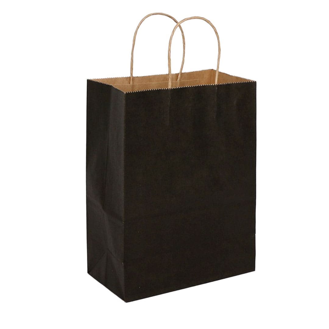 Черный крафтовый бумажный пакет с бурыми витыми бумажными ручками и плоским дном.