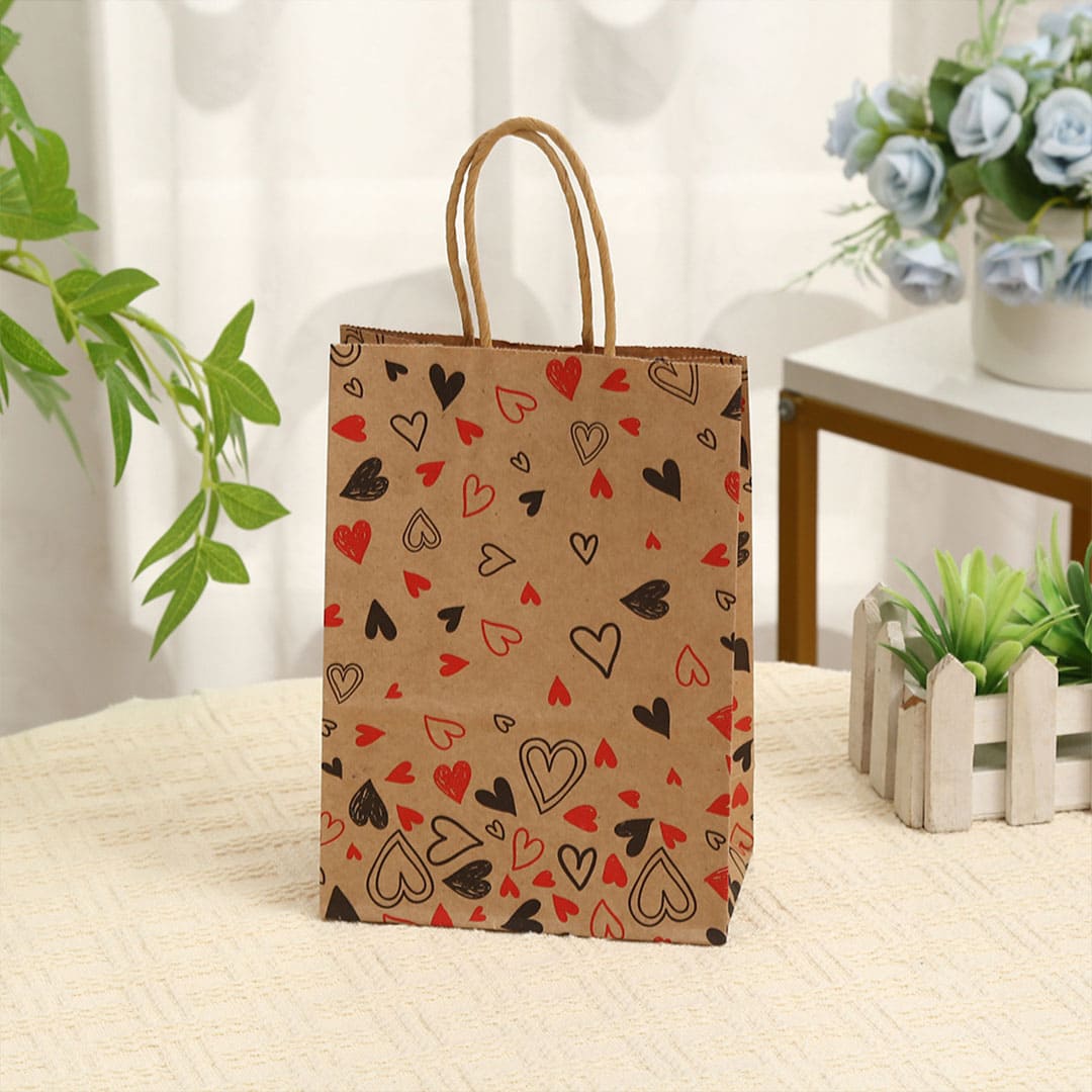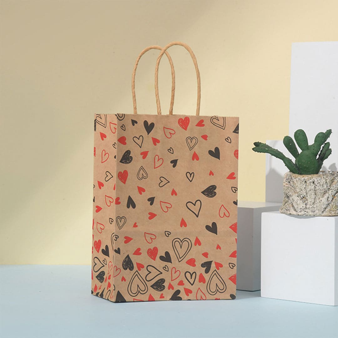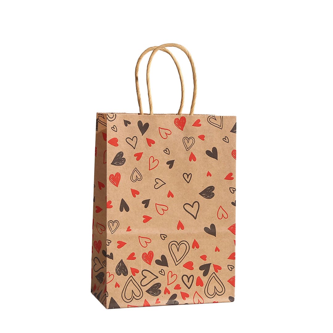 Бумажный подарочный крафт-пакет с черно-красными рисунком сердечки, витые бумажные ручки и плоское дно.