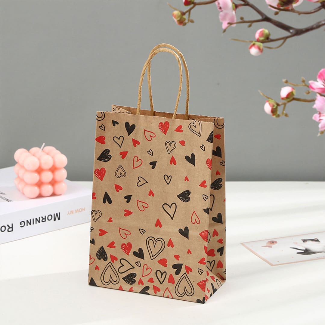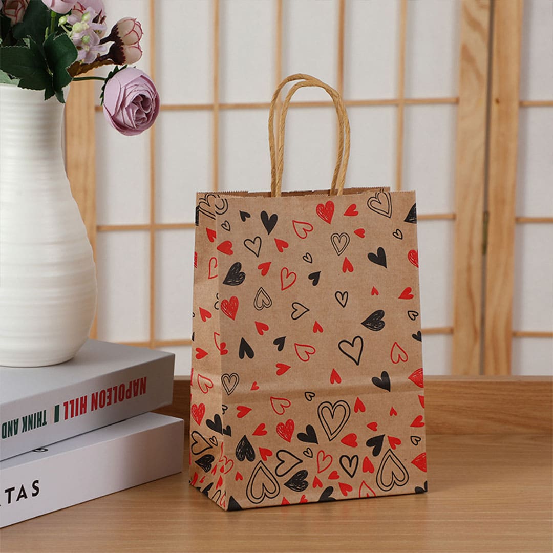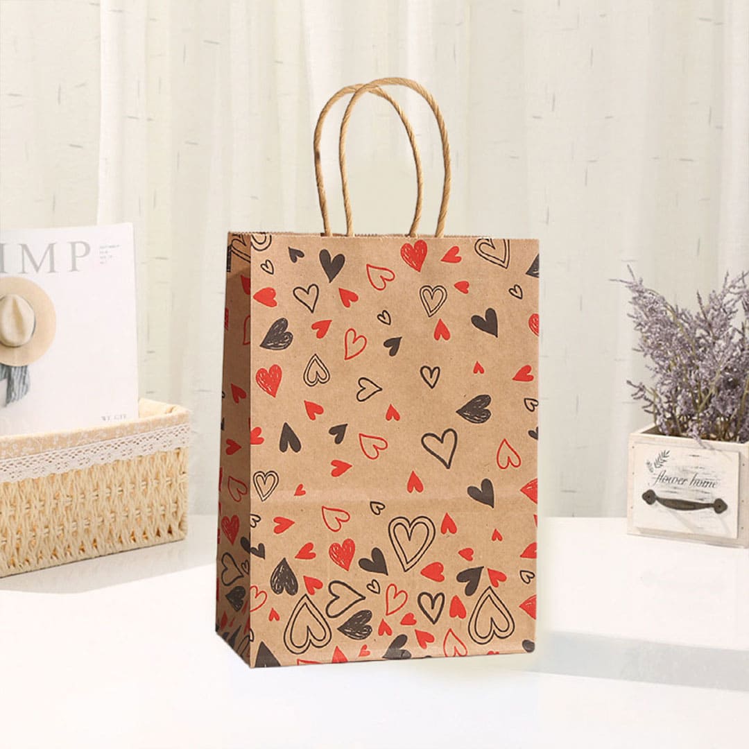 Бумажный подарочный крафт-пакет с черно-красными рисунком сердечки, витые бумажные ручки и плоское дно.