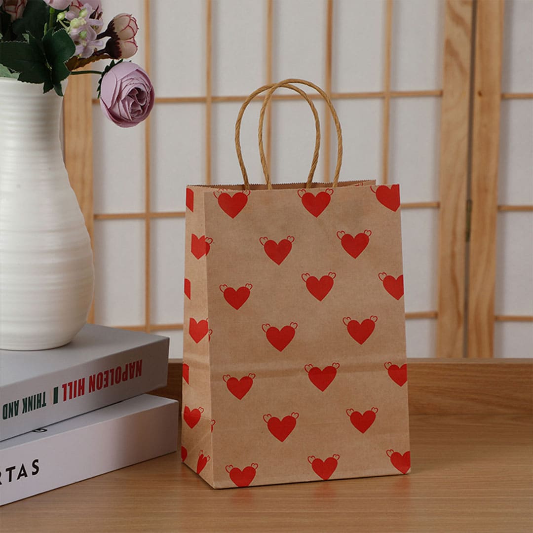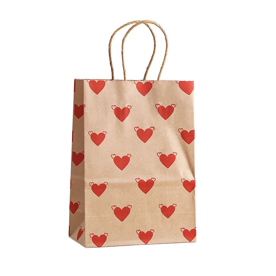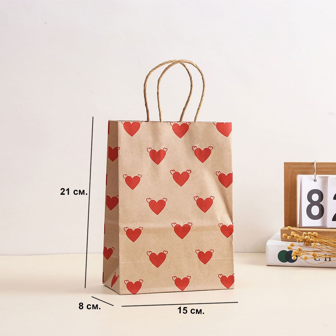 Бумажный подарочный крафт-пакет с рисунком сердечки, витые бумажные ручки и плоское дно.