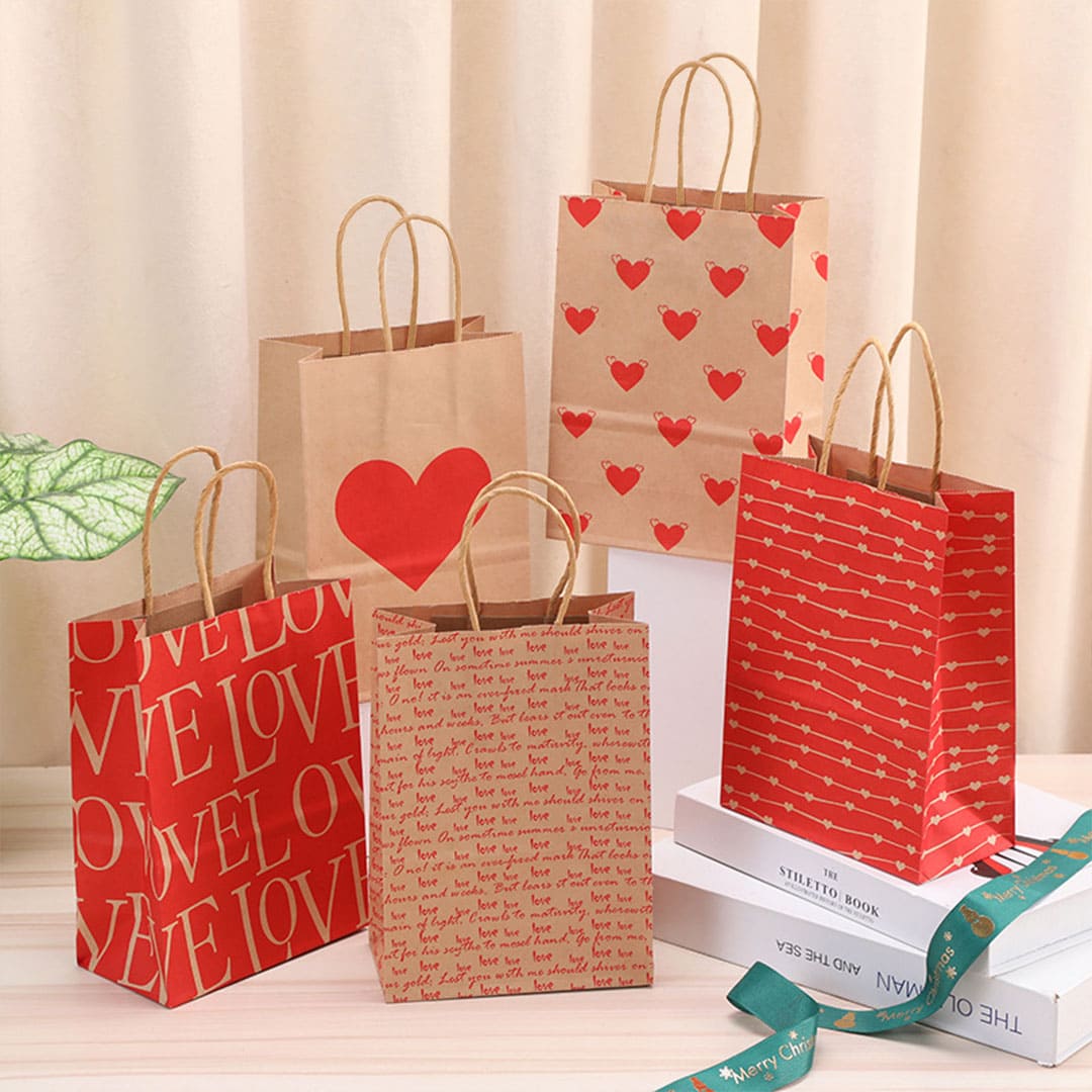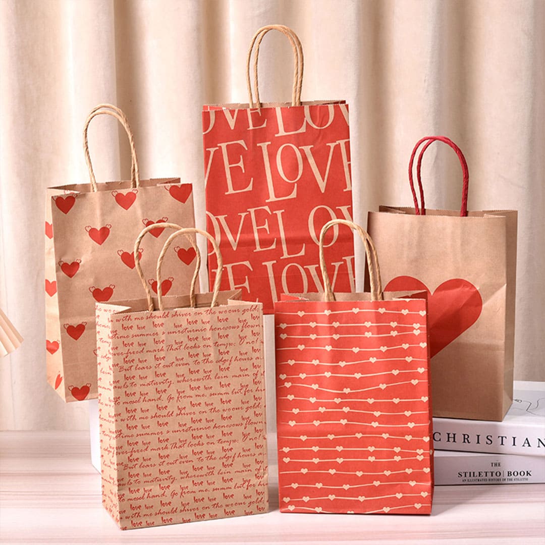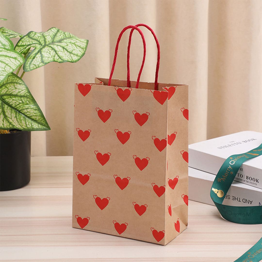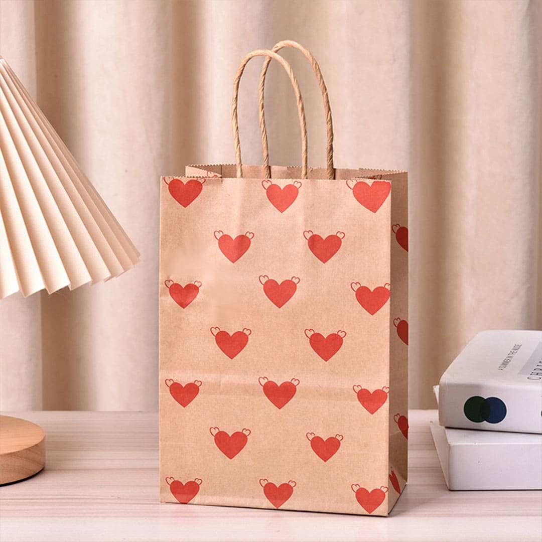 Бумажный подарочный крафт-пакет с рисунком сердечки, витые бумажные ручки и плоское дно.