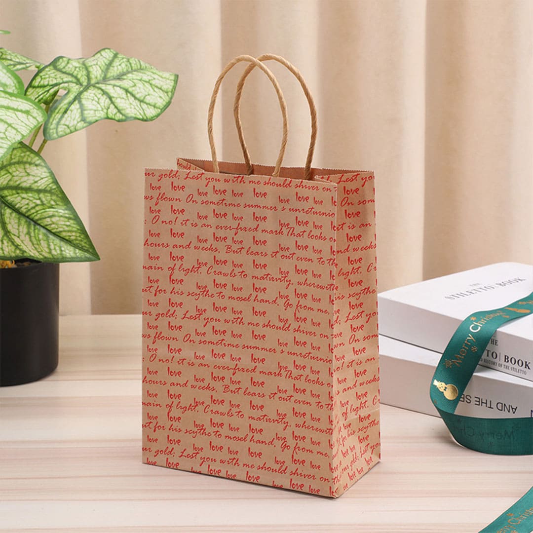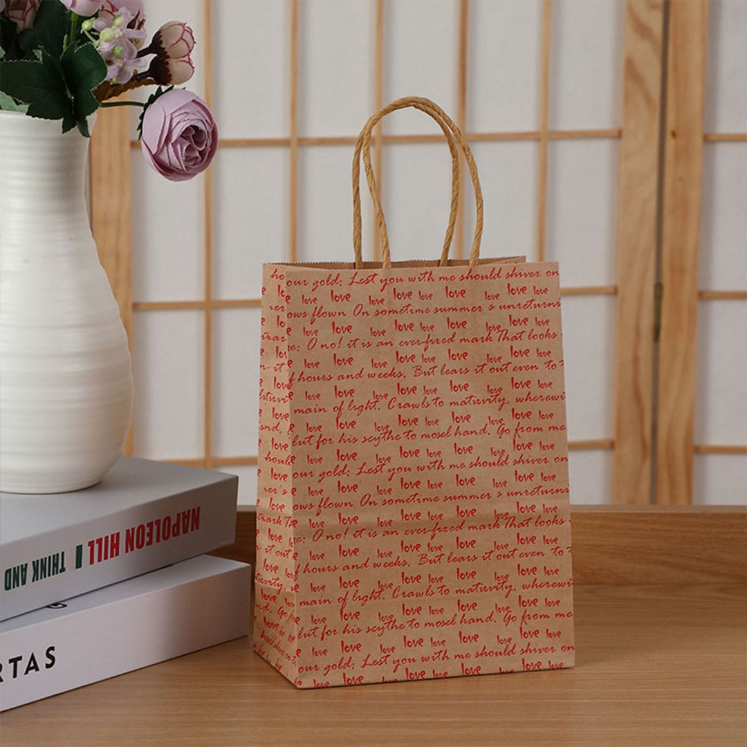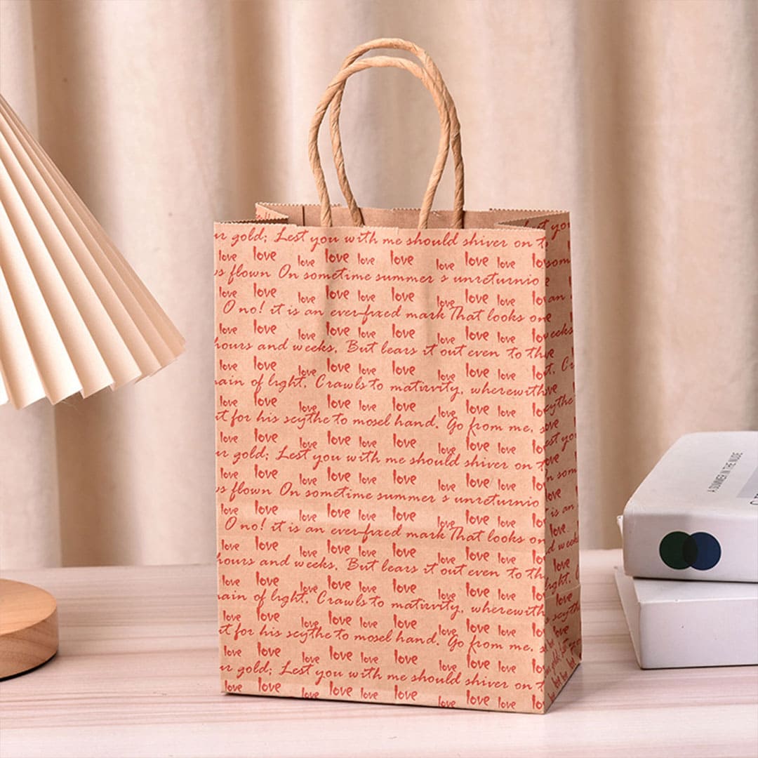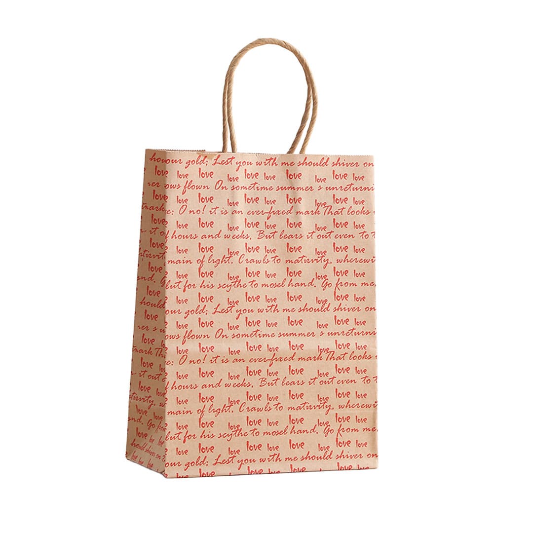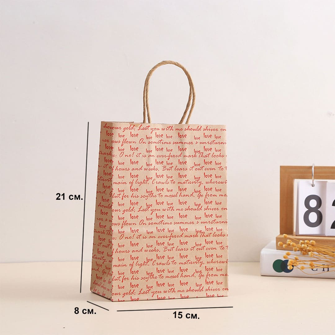 Бумажный подарочный крафт-пакет с надписями "Love", витые бумажные ручки и плоское дно.