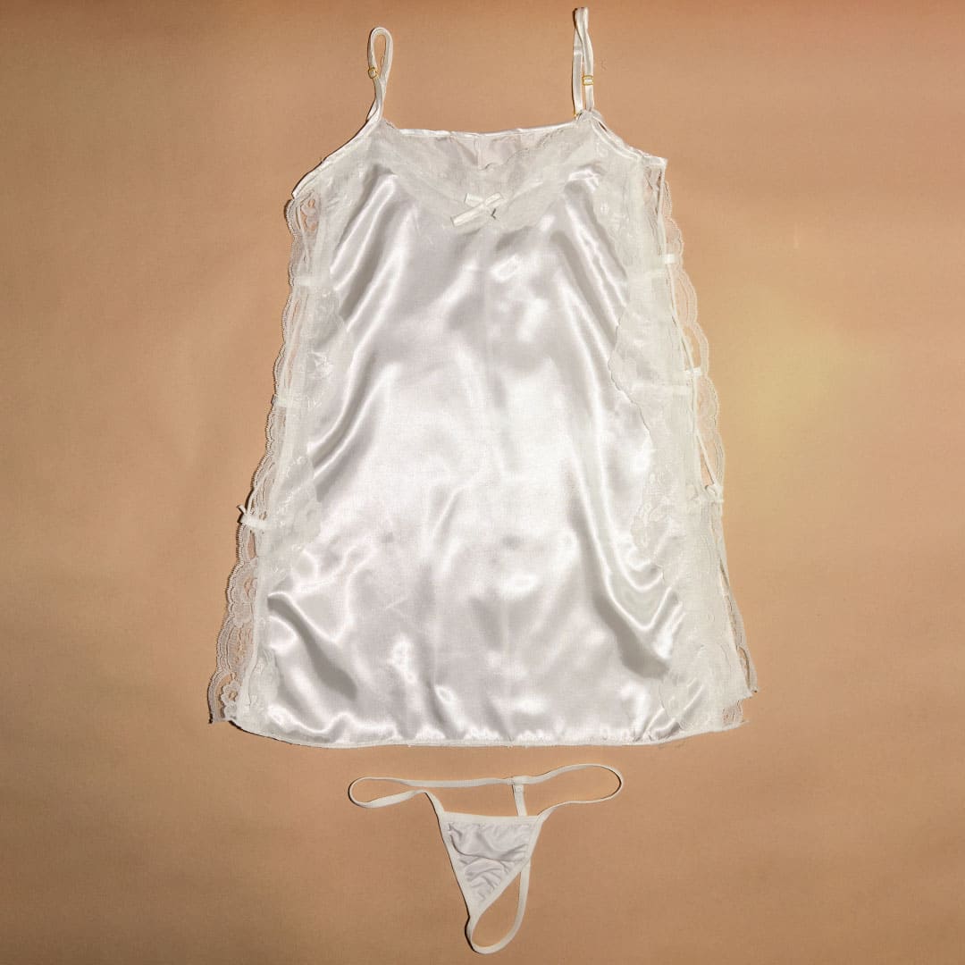 Белый эротический комплект (костюм для ролевых игр): пеньюар и трусы.