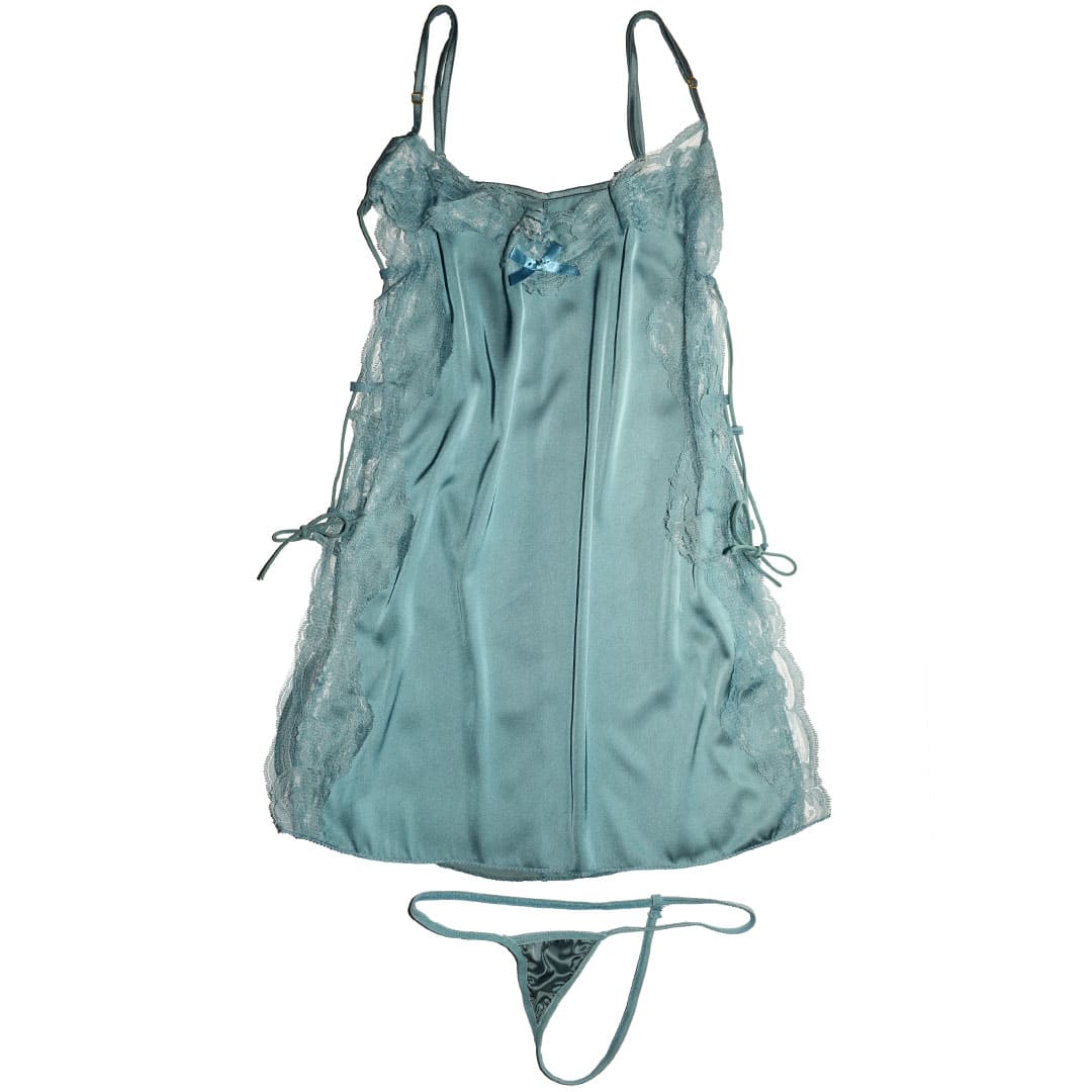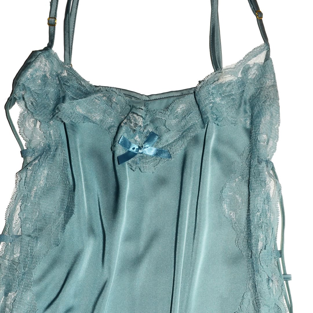Короткий атласный пеньюар на тонких регулирующихся бретельках, по верху и бокам широкое кружево, передняя и задняя часть соединяются шнуровкой.