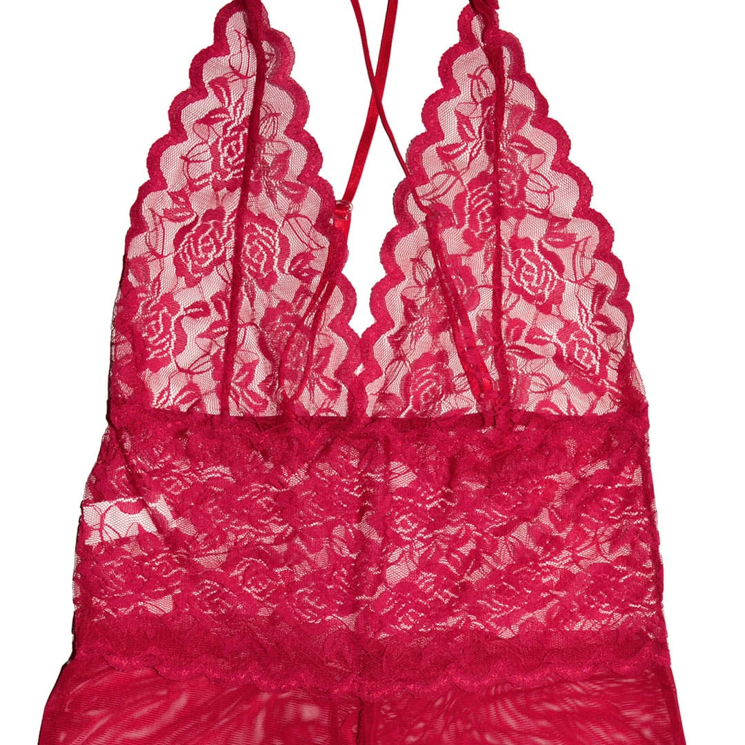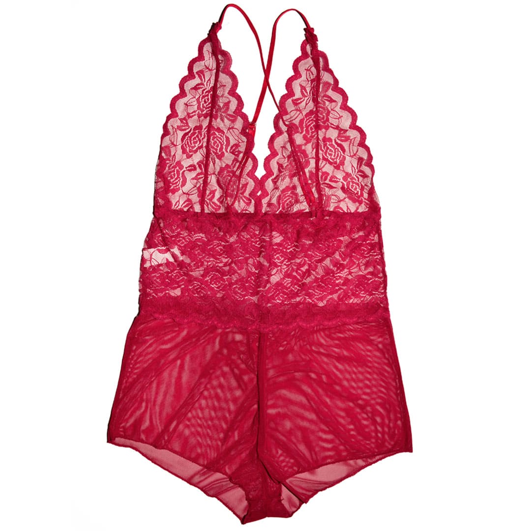 Бордовый эротический полупрозрачный пеньюар "Боди" (комбинезон, игровой костюм, костюм для ролевых игр) на тонких регулирующихся бретельках перекрещеных сзади, удлиненные чашечки из цветочного кружева, широкий кружевной пояс, внизу полупрозрачные трусы-шортики с вырезом спереди по центру.