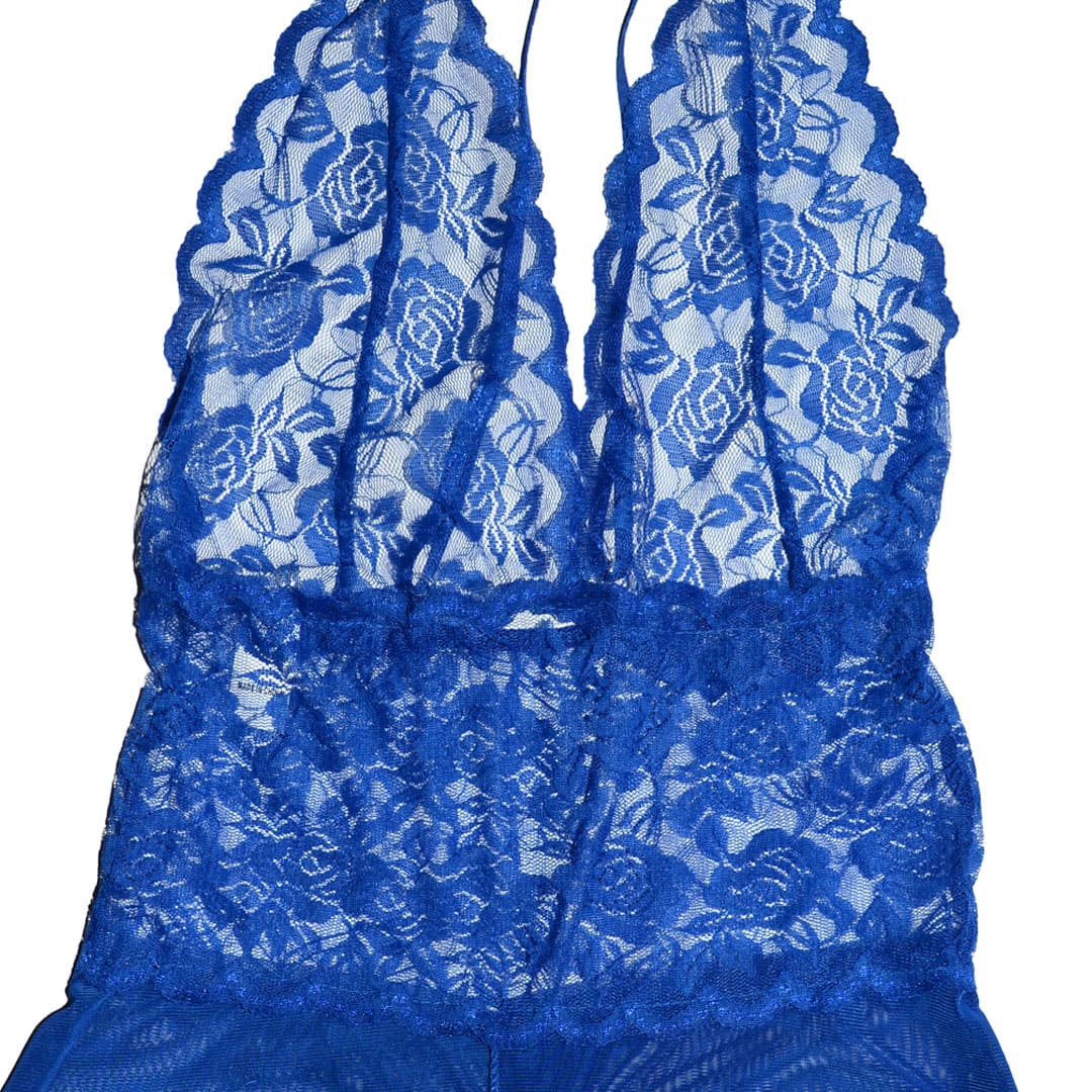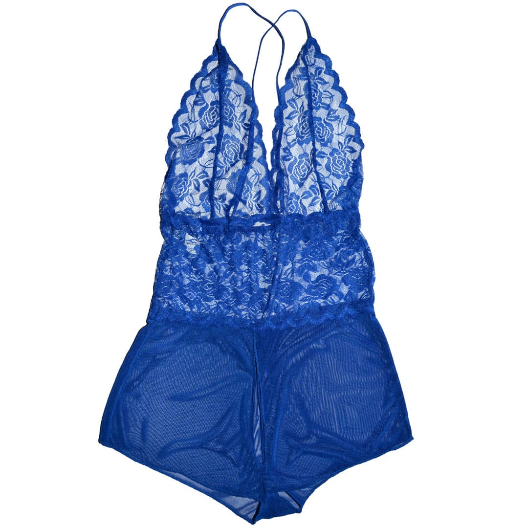 Синий эротический полупрозрачный пеньюар "Боди" (комбинезон, игровой костюм, костюм для ролевых игр) на тонких регулирующихся бретельках перекрещеных сзади, удлиненные чашечки из цветочного кружева, широкий кружевной пояс, внизу полупрозрачные трусы-шортики с вырезом спереди по центру.
