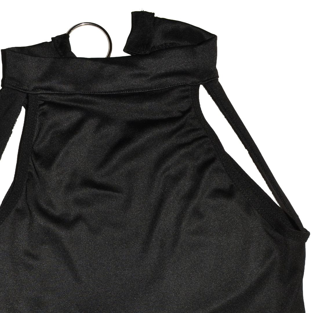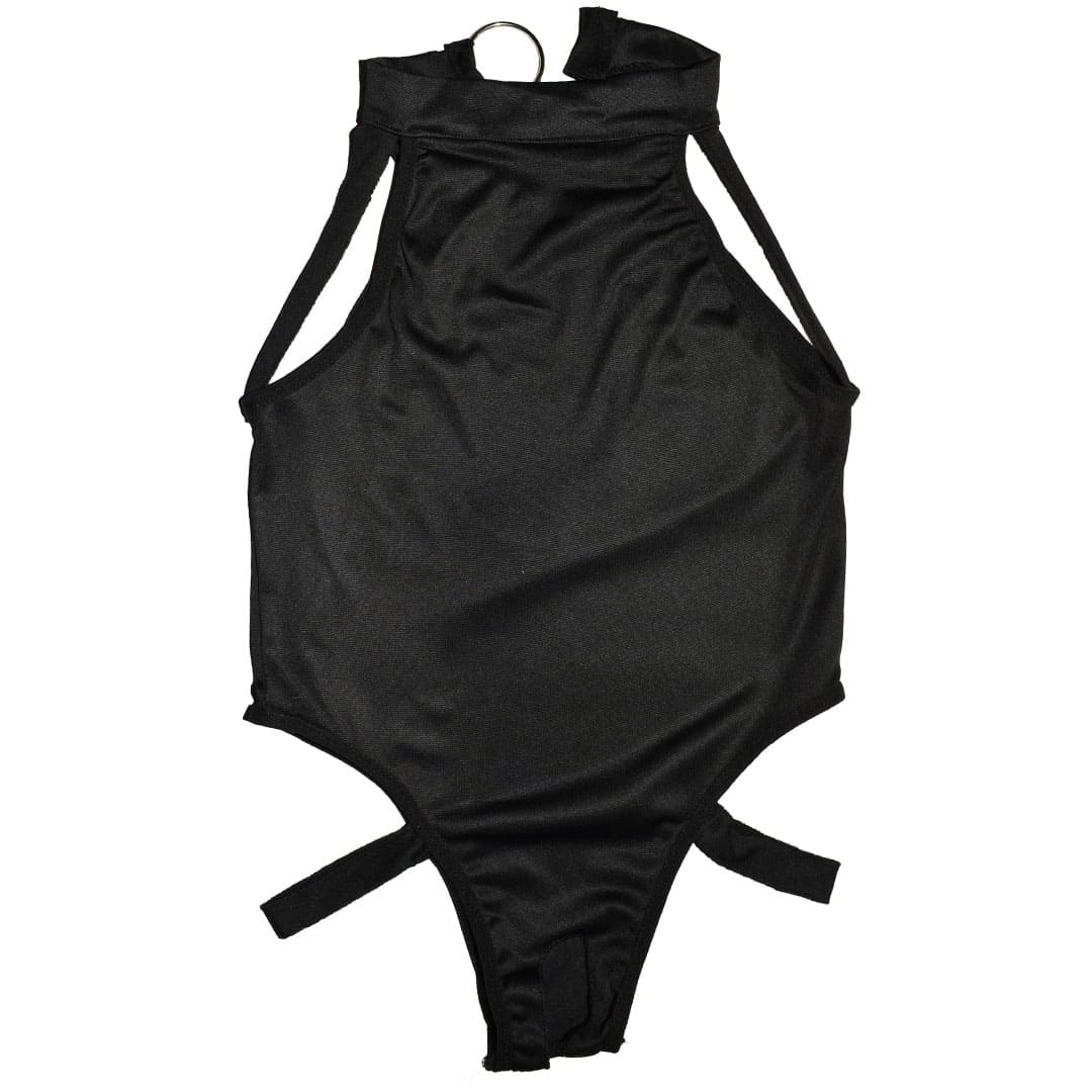 Черный эротический "Боди" (монокини, теди, игровой костюм, костюм для ролевых игр) с доступом из эластичного глянцевого материала без рукавов с воротником-стойкой застегивающимся сзади на металлическим кольцом и липучкой, под воротником вырезы спереди и сзади, спереди по вырезу руки и по вырезу ноги дополнительные декоративные полоски, внизу трусы с доступом (круглый вырез по центру ластавницы).