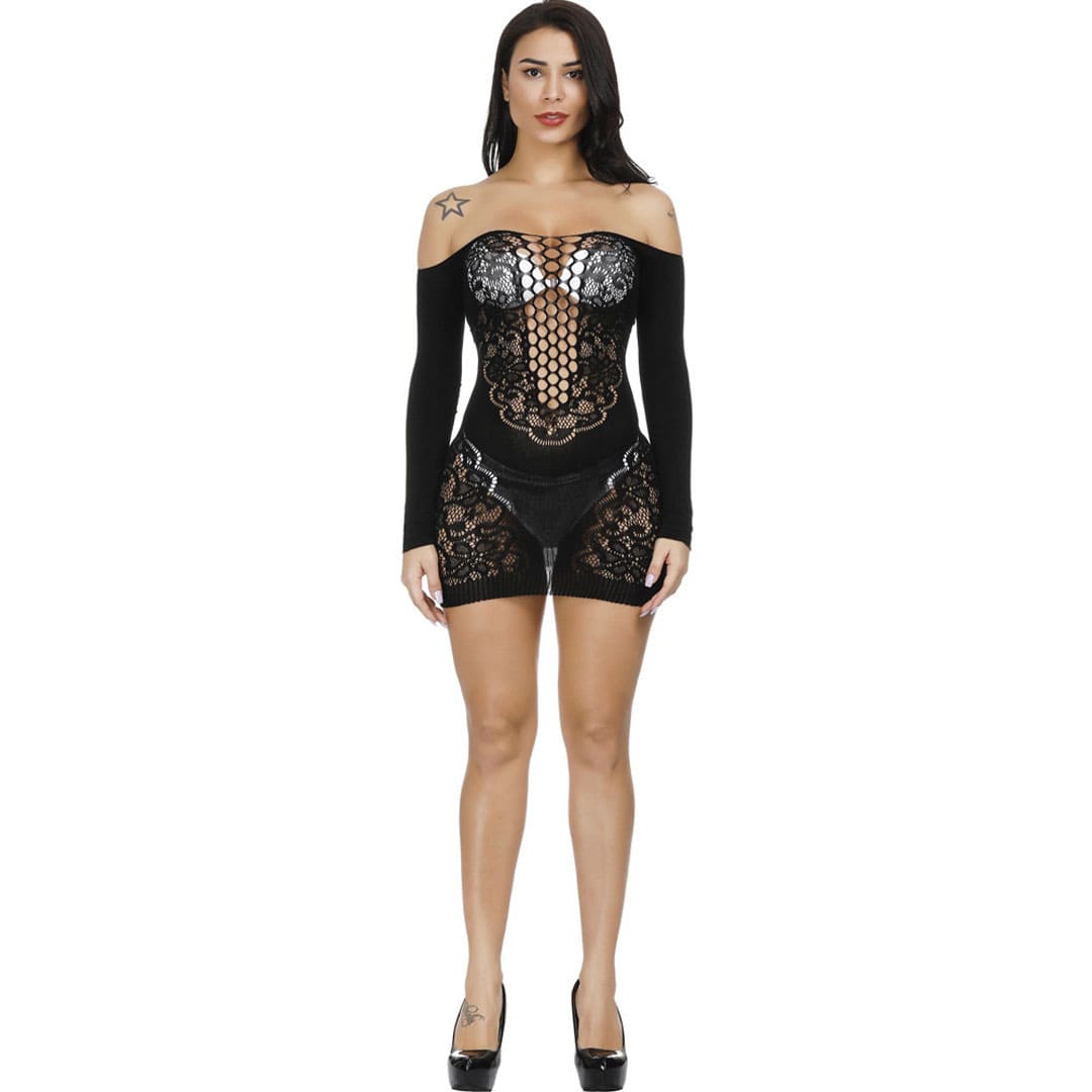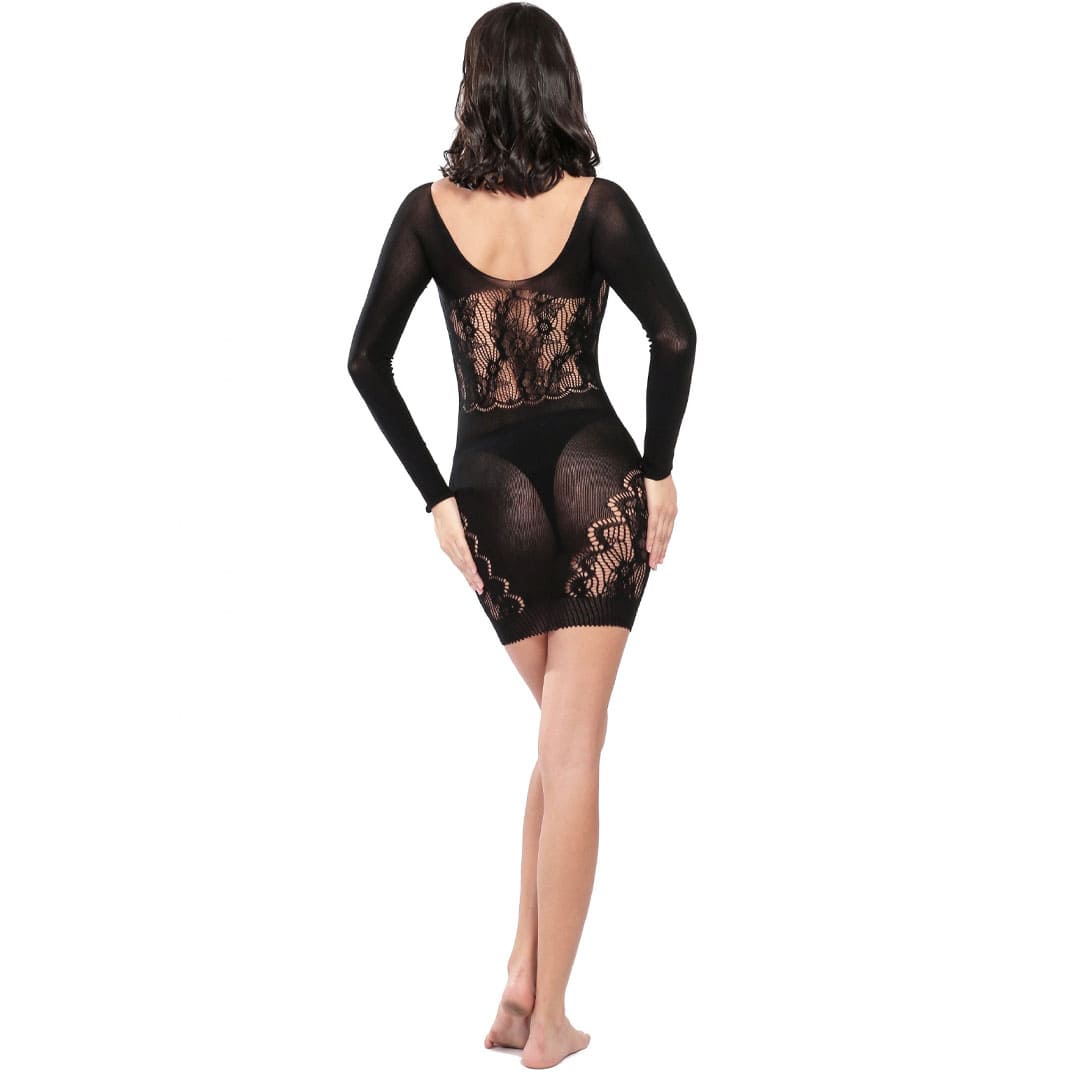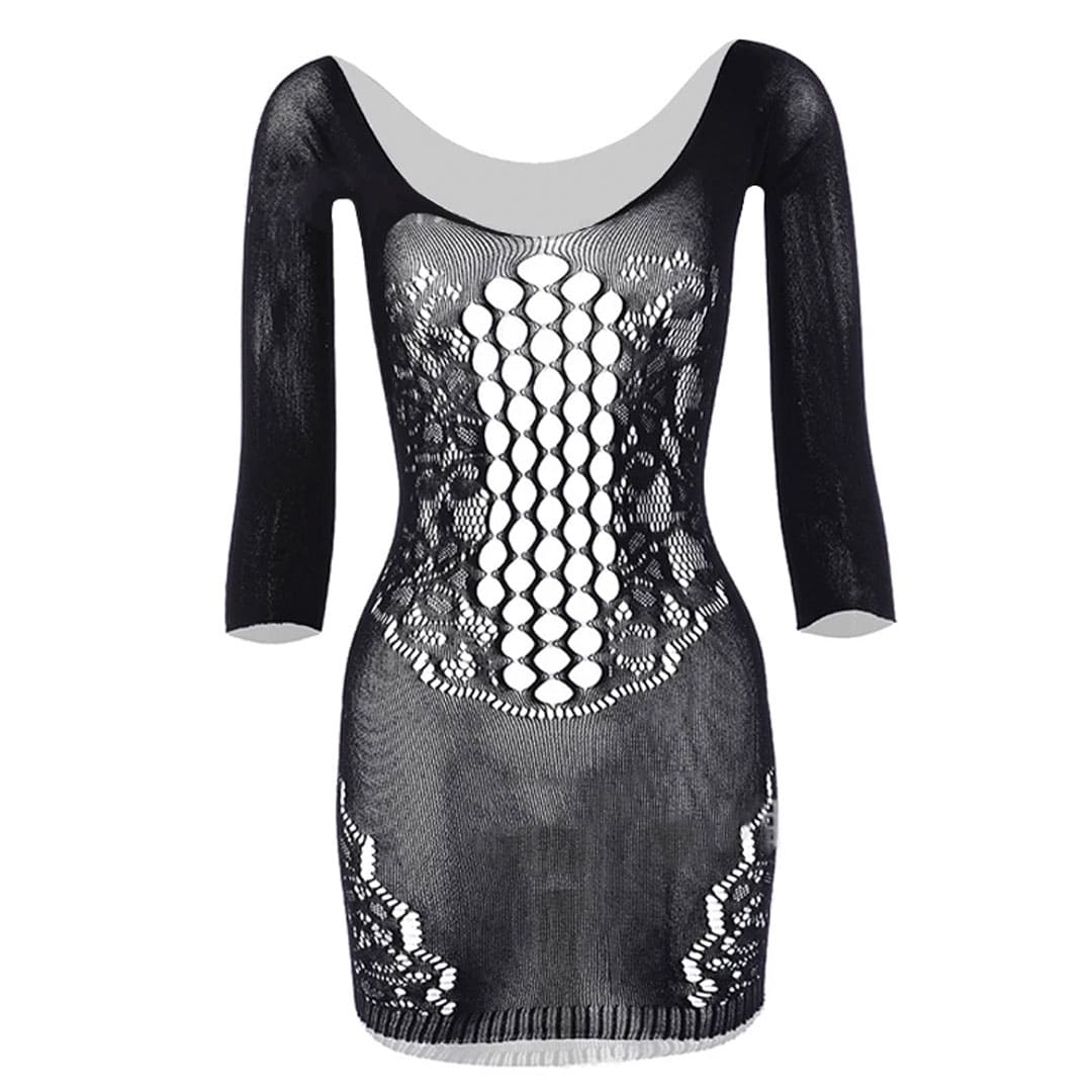 Эротический короткий Пеньюар "Сетка" с широким вырезом горловины и длинными рукавами, в области груди цветочный рисунок с вырезами круги, внизу по бокам и сзади сверху цветочный рисунок.